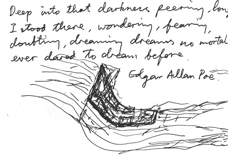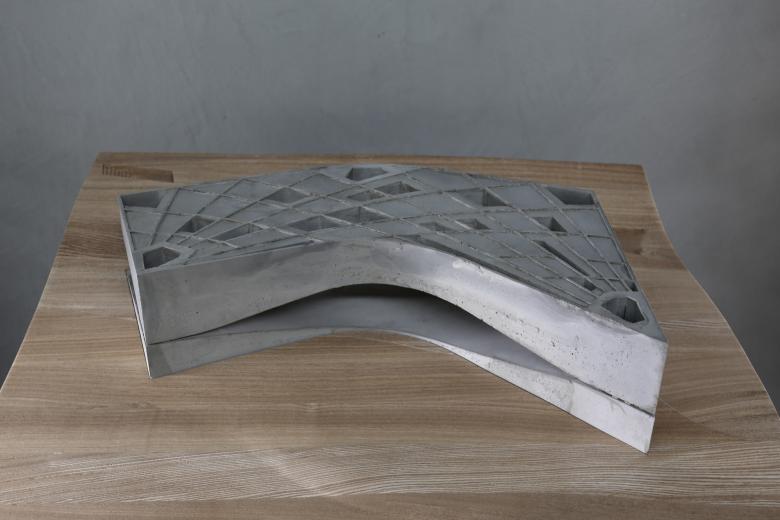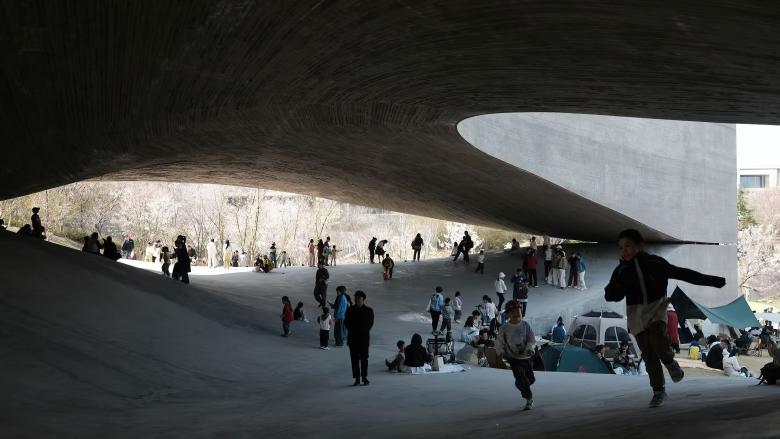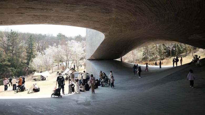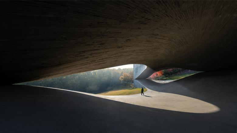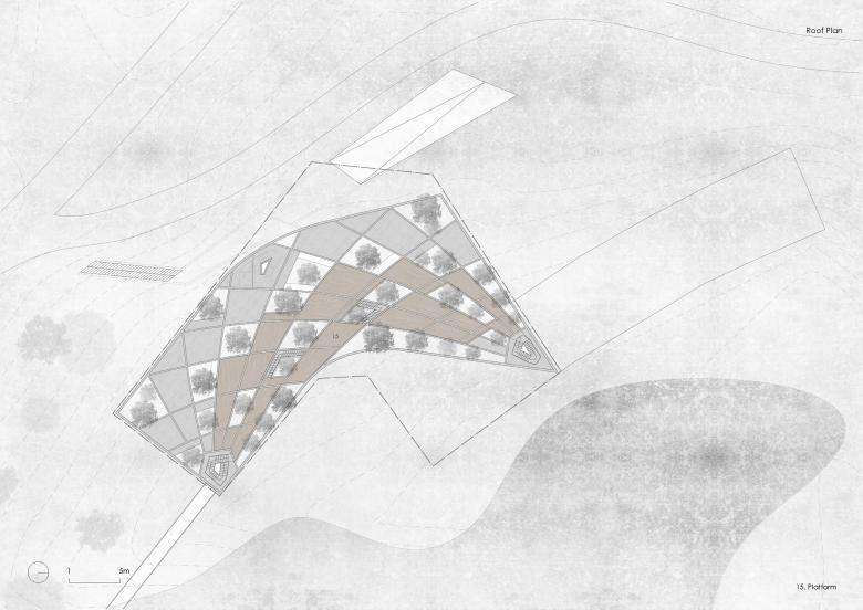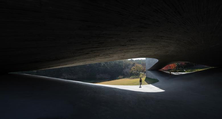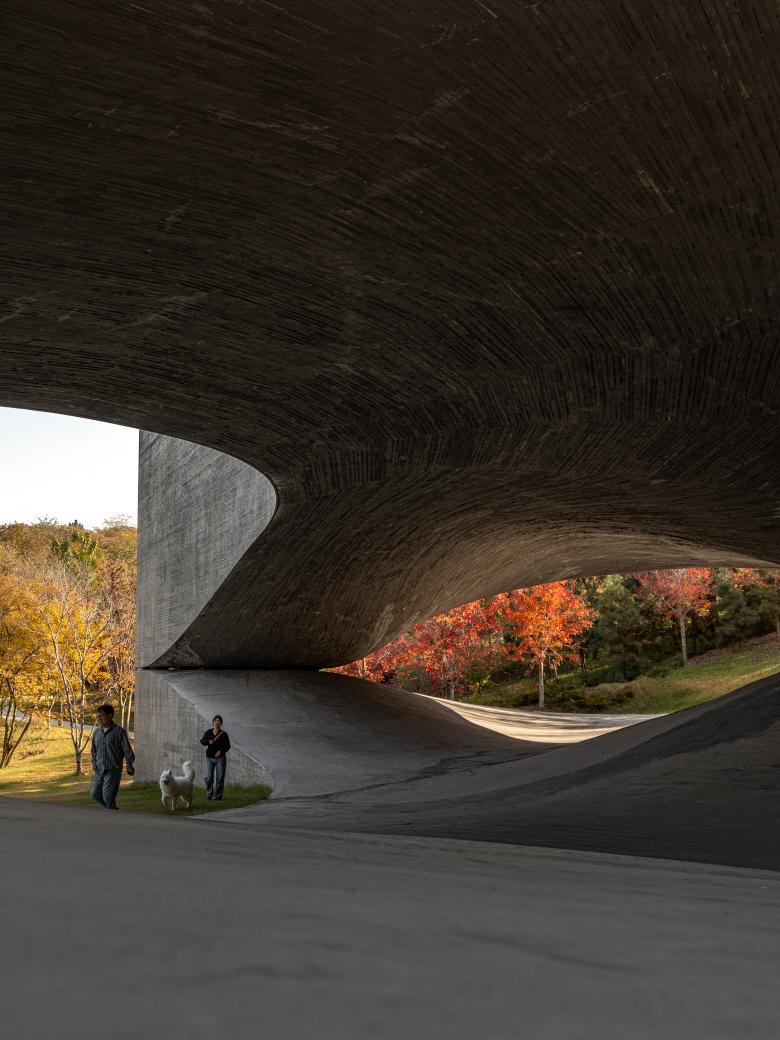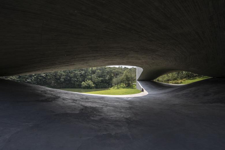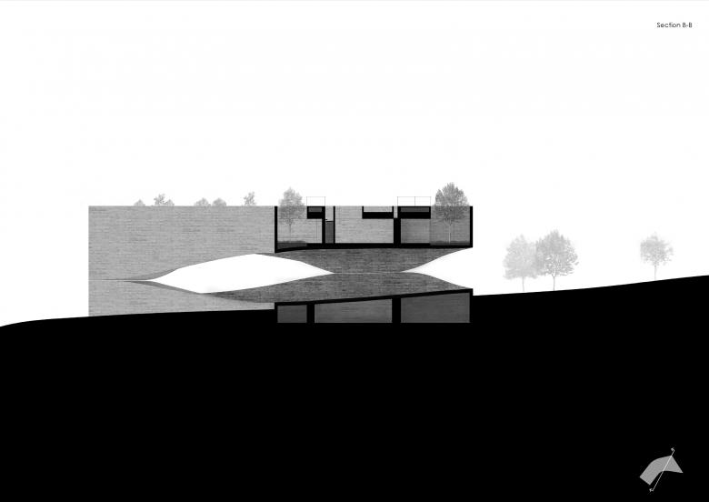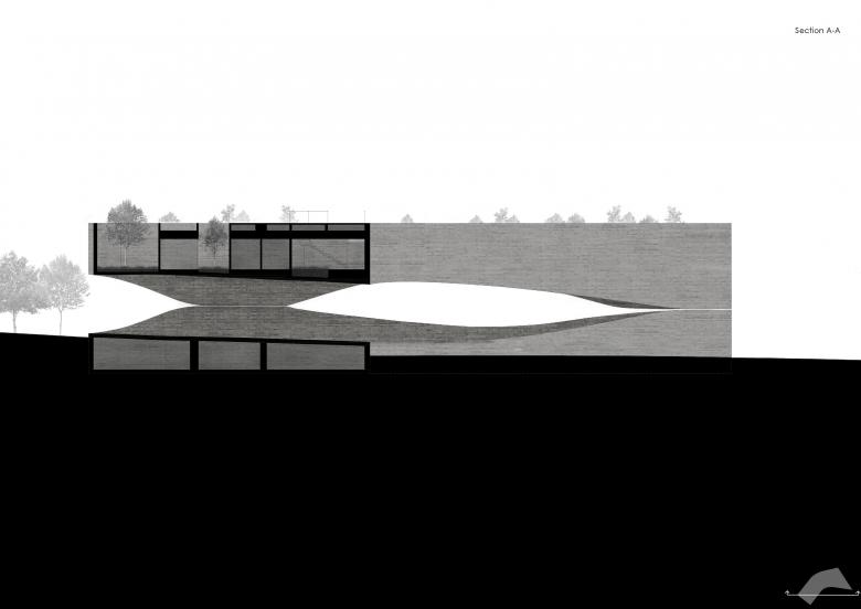 The ensemble is embedded in a hilly landscape with a small lake and makes reference to it with its curved form. The construction system consists of a curved mesh of concrete beams that support the upper part of the building on three corners. The upper story is closed to the outside and forms a labyrinthine interior landscape along with trapezoidal courtyards and spaces. The accessible roof provides a view of the landscape.
