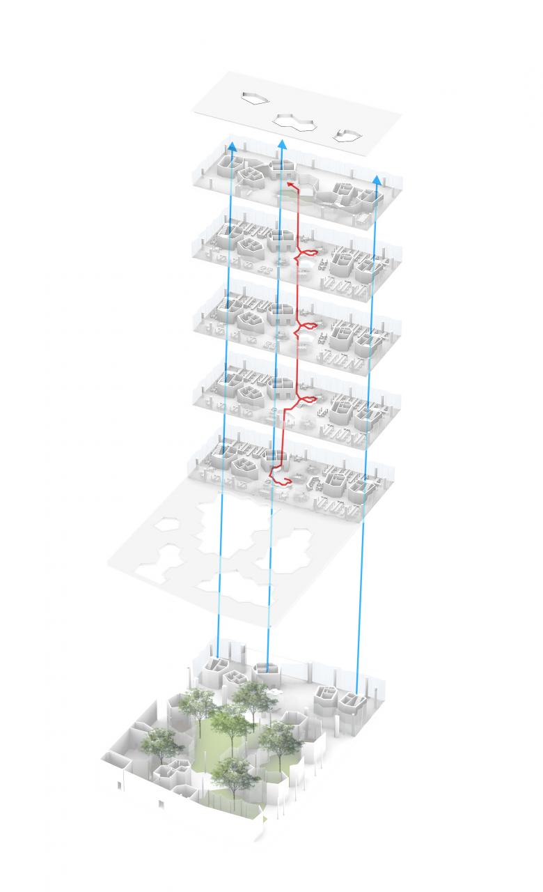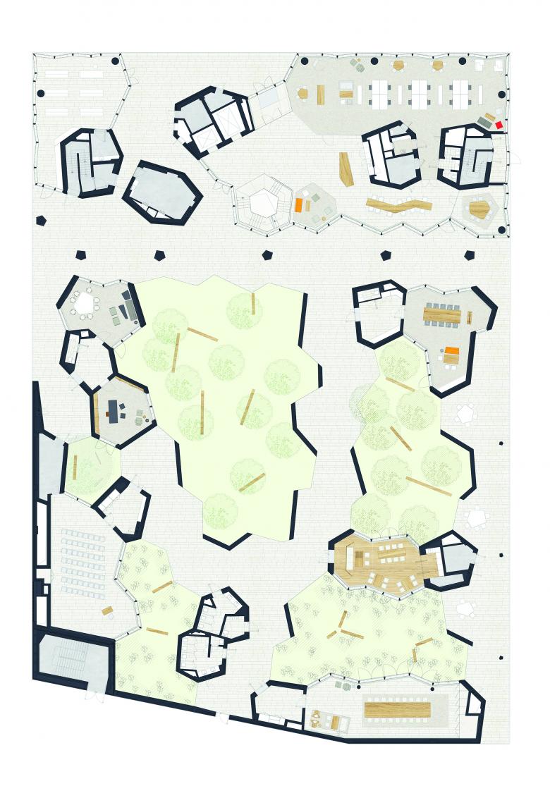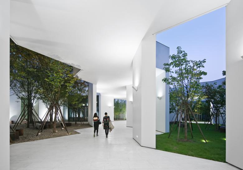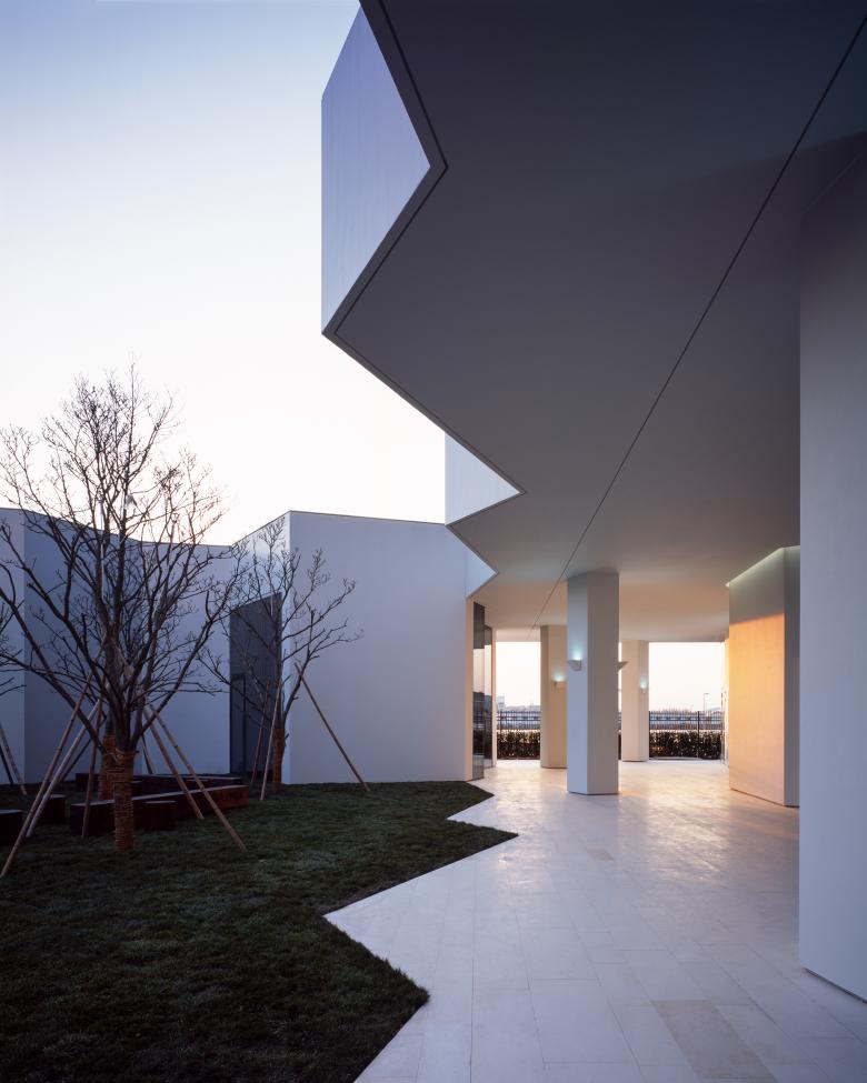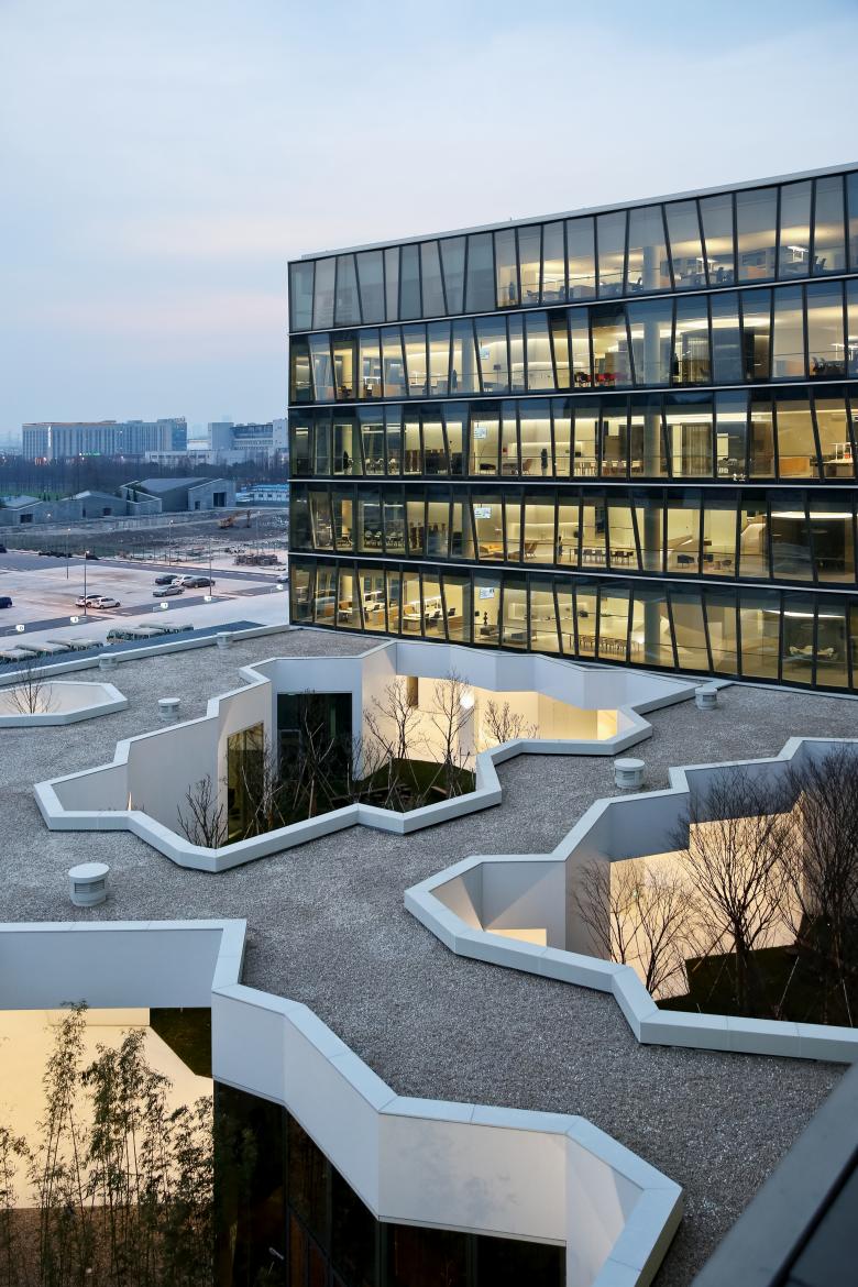 The campus of the Swiss pharmaceutical company Novartis is located along the linear Chuanyang River in Pudong, halfway between the centre of the city and the airport. Here, the architects erected a research and development centre, whose architecture is designed to encourage innovative communication between the employees. The six-storey office building with a one-storey base floor consisting of open passageways, small patios, and pavilions accommodates flexibly usable spaces equipped with individual features. The design is based on a cellular grid inspired by traditional Chinese garden design. The interior courtyards positioned on polygonal foundation elements incised into the base connect the meandering pavilions and merge inside and outside. The planting and materiality on the ground floor level form a calming contrast to the polygonal aesthetic of the spaces and to the folded glass façade of the main building, which is perceived from a distance as a shimmering surface. The ‘in-between’ character of the garden and architecture thus remains in limbo and reflects historical values of design in a contemporary way, without becoming lost in formal copies.