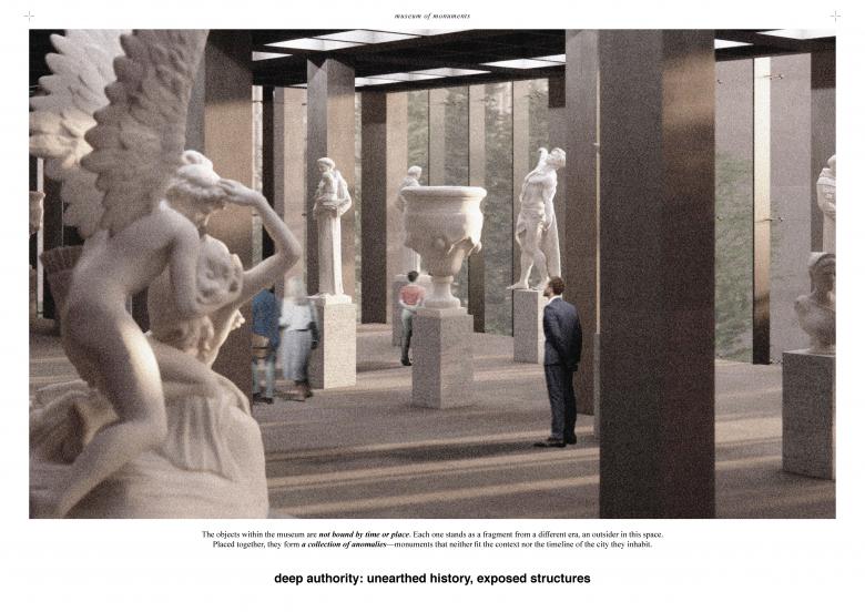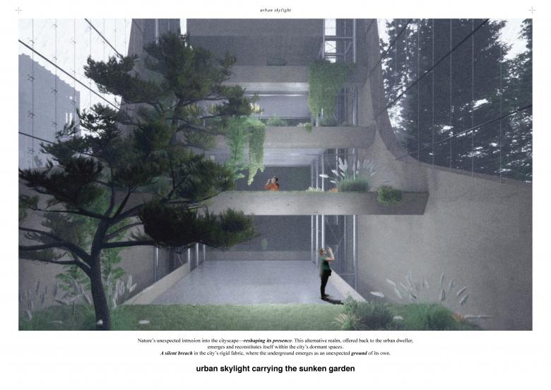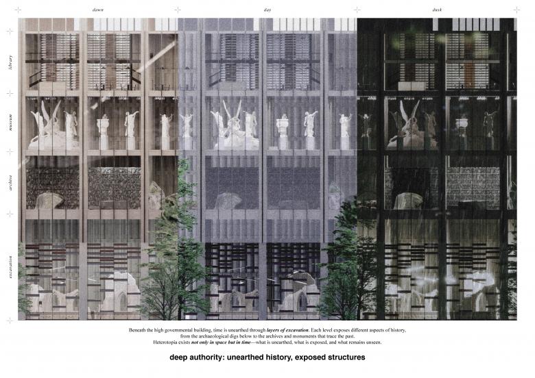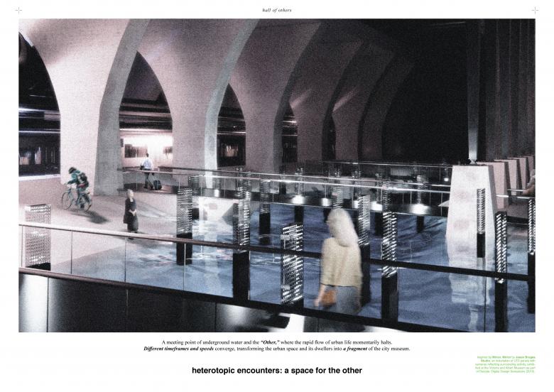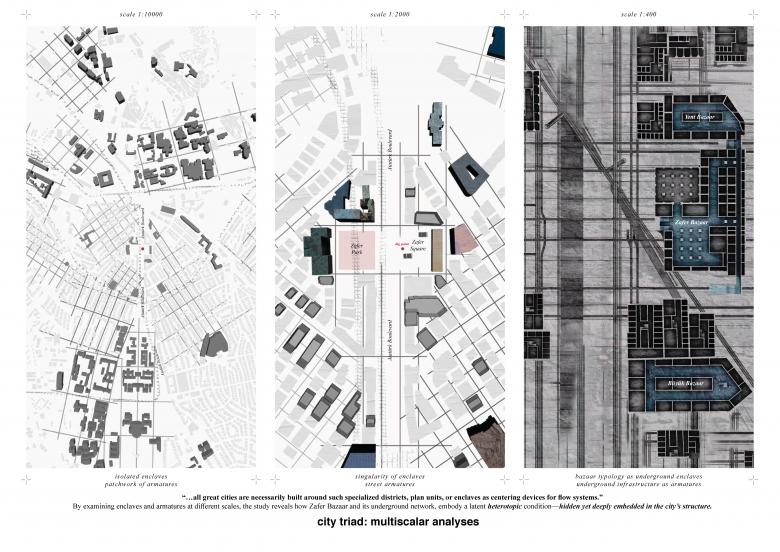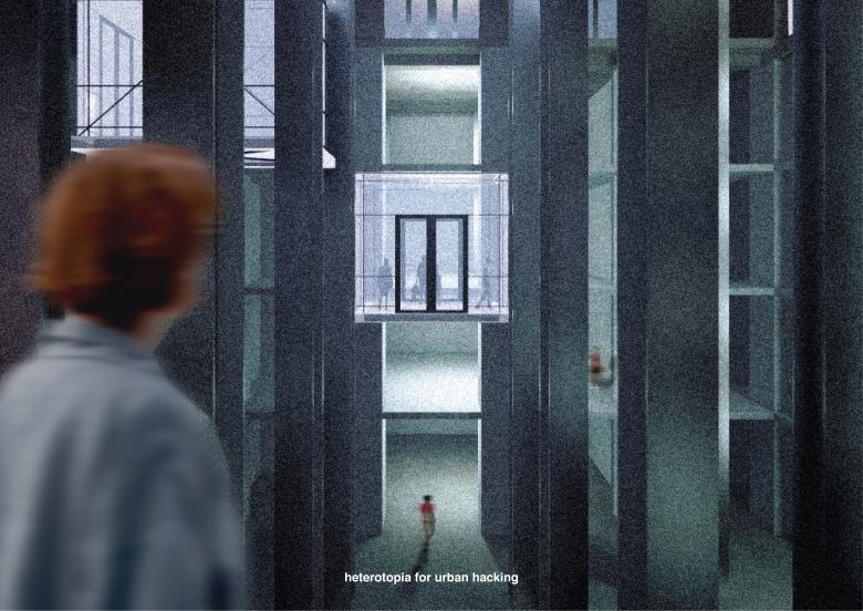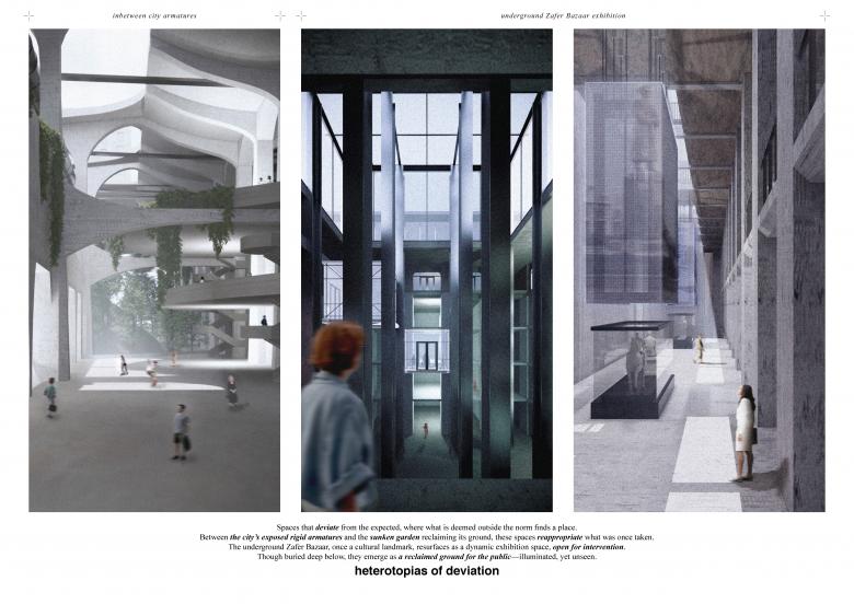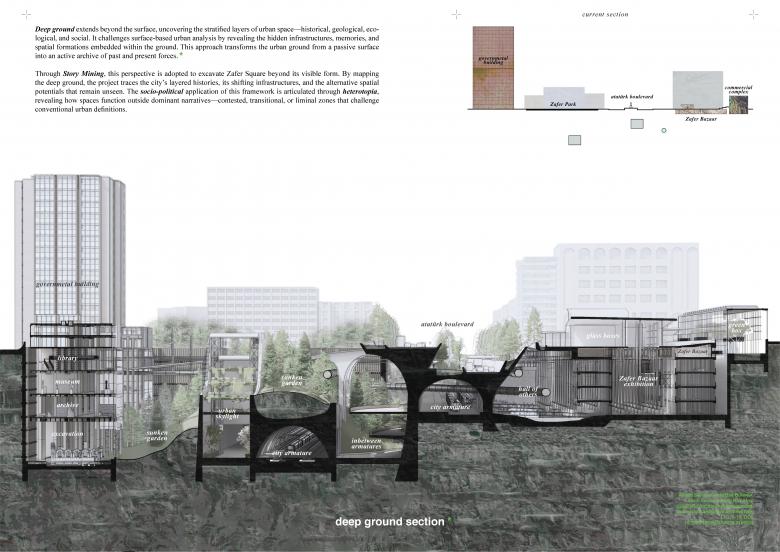 Heterotopia for Urban Hacking redefines public space through interventions that dismantle, reappropriate, and expose infrastructures to create dynamic spaces for memory and discourse. By integrating enclaves & armatures by heterotopias, it merges history, urban layers, and human interaction. "Story Mine" proposes an urban museum that excavates and preserves the overlooked histories of Ankara. In a time when environmental, social, and urban crises are debated rather than addressed, the project transforms the city into a site of narrative recovery. Instead of extracting material resources, it mines lost voices, memories, and histories, reclaiming underused urban spaces as sites for engagement and awareness. By reversing the logic of conventional mining, it turns the act of extraction into one of preservation and reactivation. Heterotopia for Urban Hacking envisions the city as a layered narrative space, where overlooked infrastructures and contested public spaces become catalysts for transformation. By Story Mining through ""deep ground"", the reappropriation of urban elements—the governance building, Zafer Park and Bazaar, and underground infrastructures—revealing hidden narratives in Ankara’s fabric unfolds. Drawing from Foucault’s heterotopia, the project creates a spatial condition where contradictions coexist, allowing history to be reinterpreted, social engagement redefined, and urban memory activated. Structured through David Grahame Shane’s city element triad, it mediates enclaves and armatures through heterotopias, integrating permanence and flux into an evolving urban experience. Once a static enclave, the governance building becomes an evolving archive, exposing excavation layers where artifacts and histories are exhibited, while its upper floors transition into a library preserving the city's uncovered stories. A sunken garden replaces a conventional park, creating vertical connections between underground levels and introducing an alternative ground. In Zafer Bazaar, reinterpreting its gallery and foyer as volumetric rather than planar armatures fosters engagement with the site’s cultural history. Armatures, typically facilitating flows, are disrupted and made tangible. Subways, water channels, and utility corridors transform into immersive spatial experiences, intersecting history, infrastructure, and daily life—turning visitors into both observers and participants. By redefining urban occupation, Heterotopia for Urban Hacking becomes an urban museum—resisting fixed meanings, evolving, and challenging conventional understandings of presence, history, and public experience.