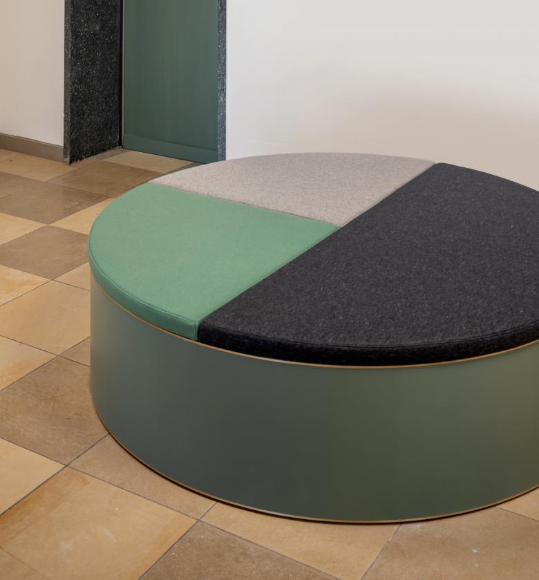 Feststehende Möbelelemente erweitern in den Fluren das Gestaltungskonzept. Sie dienen sowohl den Kindern, als auch den Erzieher:innen als Sitz-, Ruhe- und Kommunikationsflächen.