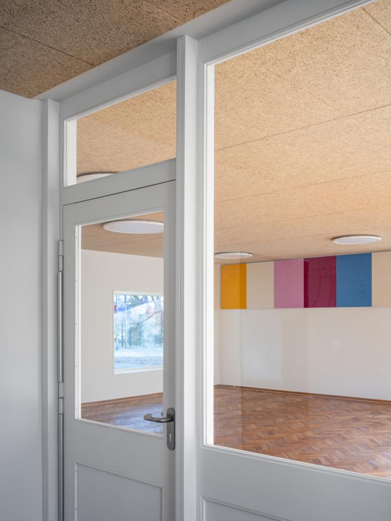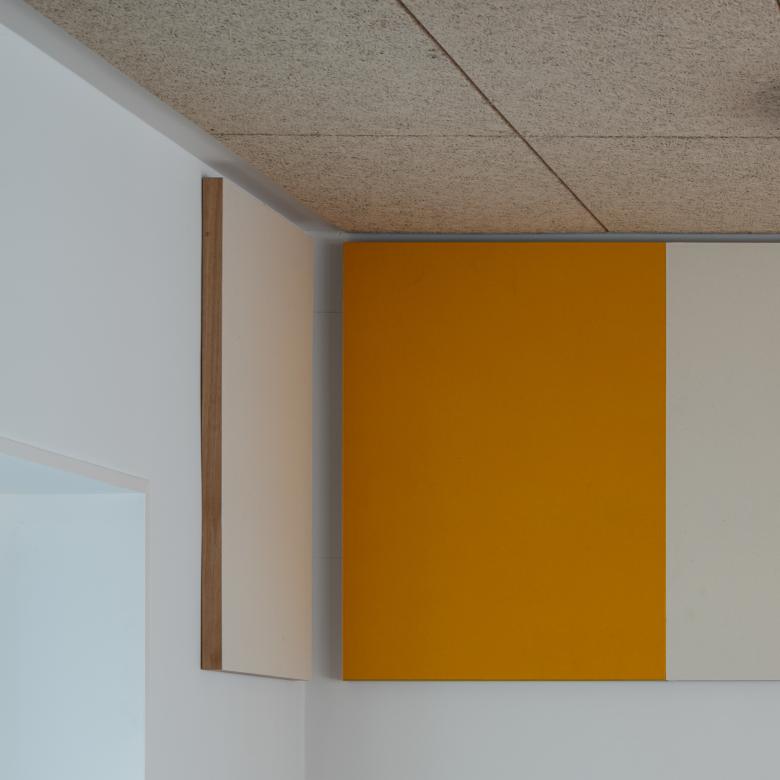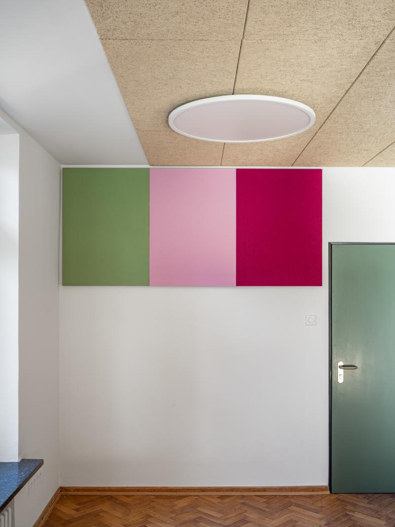 So wechseln beispielsweise die Grüntöne der akustisch wirksamen Deckenpaneele in den Flur-, Garderoben- und Eingangsbereichen. In den Gruppen- und Bewegungsräumen hingegen erhalten die Deckenakustikpaneele einen neutralen Naturton. Neben den Holzwolle Paneelen an den Decken sorgen mit Filz bezogene Akustikpaneele an den Wänden für eine angenehme Akustik. Um unsere Erde zu schützen, wurden für die Filzbezüge Restbestände verwendet. In unterschiedlichen Farbkombinationen geben sie jedem Gruppenraum neben den neutralen Deckenflächen etwas Eigenes. Im Schlaf- und Bewegungsraum verbessern raumhohe Filzvorhänge nicht nur die Raumakustik, sie dienen auch der visuellen und atmosphärischen Wandelbarkeit des Raumes. Gleichzeitig lässt sich der Raum für den Mittagsschlaf der Kinder durch diese vollkommen abdunkeln.