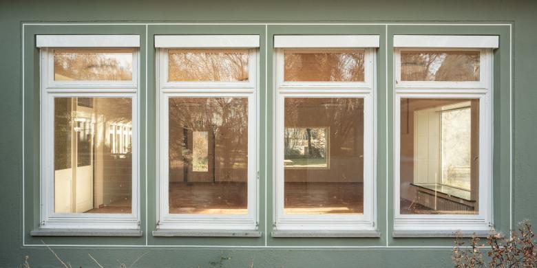 Auch von außen erscheint die Kindertagesstätte rundum in neuer Farbe. Auch die einst lieblos behandelte Rückfassade wird mit dem dunkelgrünen Anstrich und weißen Schattenstrichen um die Fenster strukturiert und rhythmisiert. Die Eingangstüren wurden erneuert und erscheinen in dem selben Grünton, der sich schließlich entlang der Innentüren durch den gesamten Hortbereich zieht.