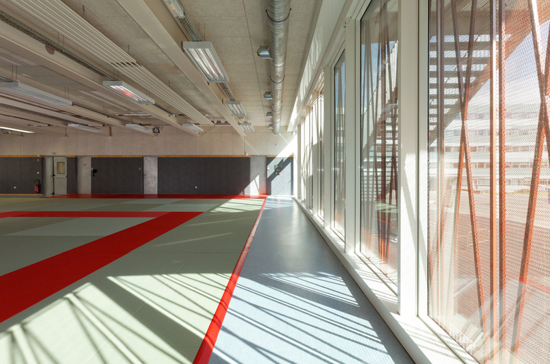 All the halls are designed for competition activities. The gym and the box training hall on level -1 are naturally lit by a continuous range of windows oriented to the pathway. A zenithal window tape on the maintenance free green roof provides additional natural light to the 2 halls. The martial arts training hall is situated towards the courtyard of the high-school and equally equipped with large windows in the upper part. On the first floor are situated the judo hall with 2 tatamis and a fully equipped fitness room combined with changing facilities, showers and some small offices dedicated to the administrative staff of the sport clubs. The second floor is entirely occupied by the basketball hall. A floating oak sport parquet covers the floor. The storage for sport material is separated from the sport field by wooden wall bars. Natural balanced light is provided by sheds integrated in the roof. Covered with double glazed windows they allow the evacuation of hot air in summer and prevent the hall from overheating. On the last two ranges of sheds 10 solar panels are fixed supporting the heating and warm water production of the building. All interior walls of the sport halls received acoustic treatment and where necessary shock-treatment.