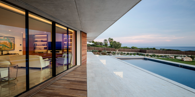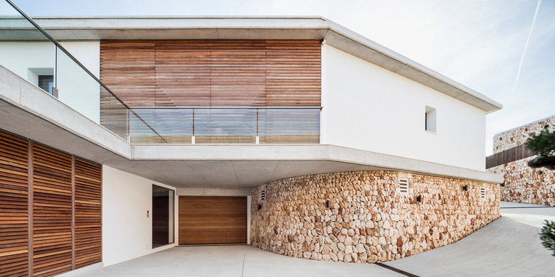 This project began in the form of a contest. The main concept of the project has stayed unchanged since then. We proposed a dwelling containing two minimum slabs with radical dimensions: 42m long x 3m high. Two housing units within the same plant are separated by a patio with the main function of generating warm winds. By taking advantage of the dimensions of the plot, the 42 meters of flat façade allow us to distribute the main program to the south, leaving on the north side the spaces with minimum openings. The distribution of the program in the plant allows us to make more flexible uses of the house, allowing the segregation of the main house and the guest house with the patio as a connecting link. To avoid the overexposure of the house in the surroundings, the level of the floor was depressed and a slab of slanted concrete roof with a changing section on the north-south axis was created. At an even lower level, the swimming pool that exerts the boundary of the hard pavement with the garden was designed, which, in turn, gradually becomes a Mediterranean landscape with no water consumption. All the water that falls on the roof of the building is recovered, accumulating in a 40-ton water tank located at the level of the large basement that occupies 50% of the building and which is accessed by a ramp. The white, the concrete, the wooden lattices and the glass create the facades on the ground floor while the drywall is the protagonist when we cross the limit of the height 0.0m. The current technology in terms of enclosures allows us the ambivalence of hiding all the glass inside the walls when the house is in use and, in the contrary, being able to "bunkerize" the house through sliding shutters when desired.