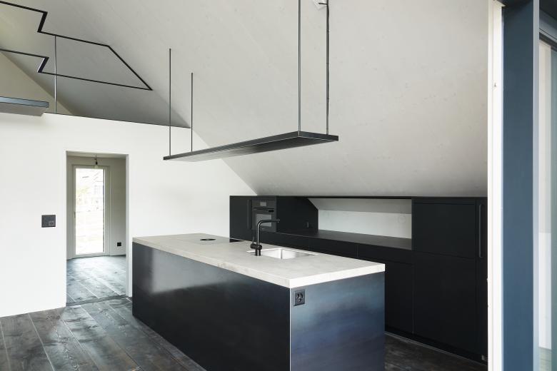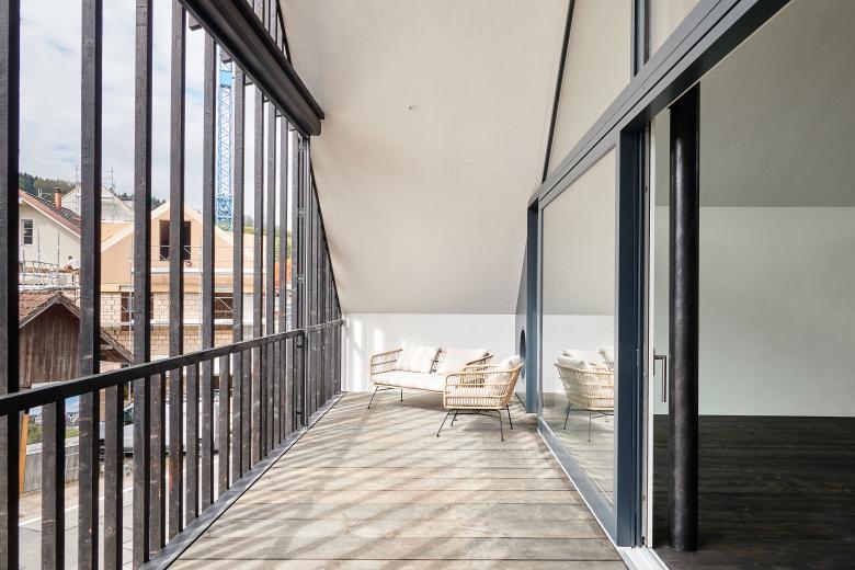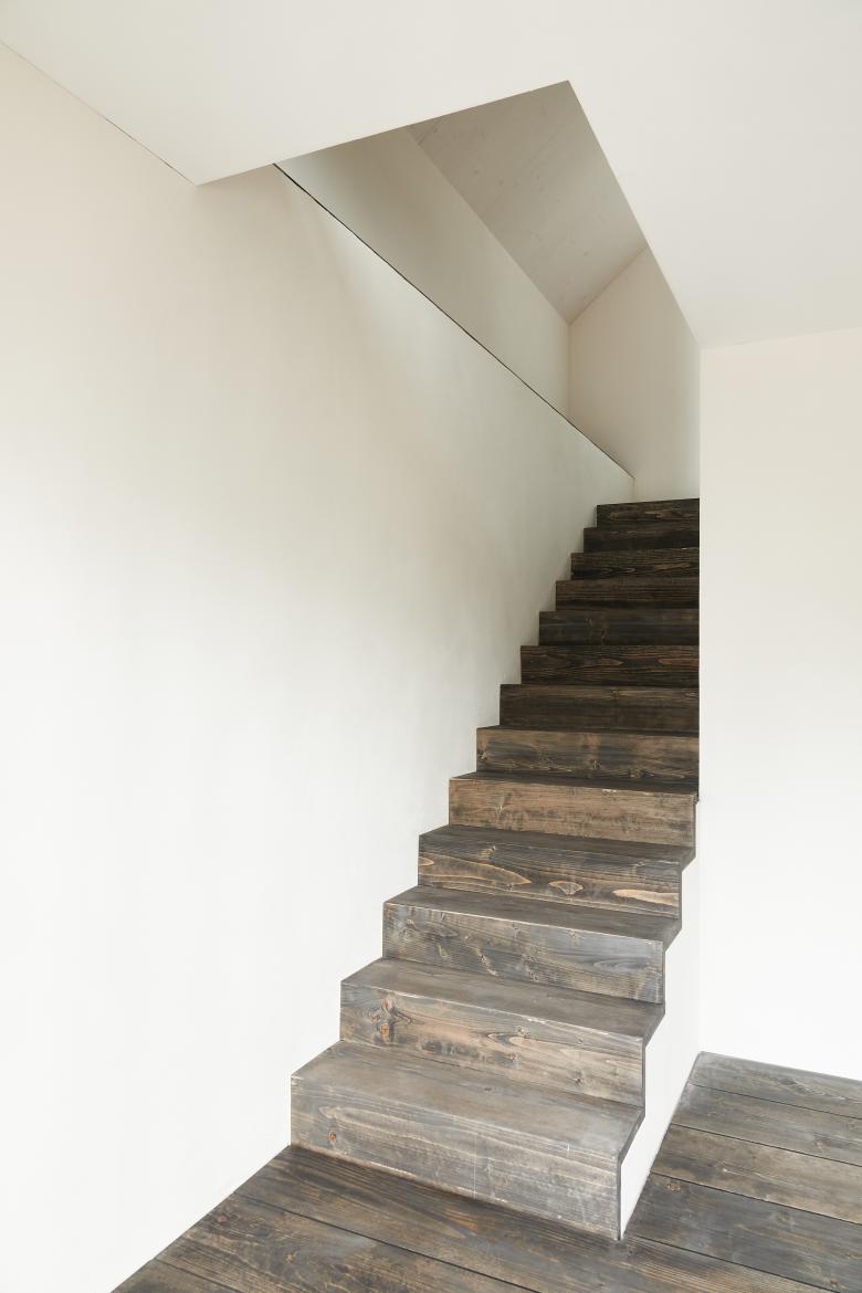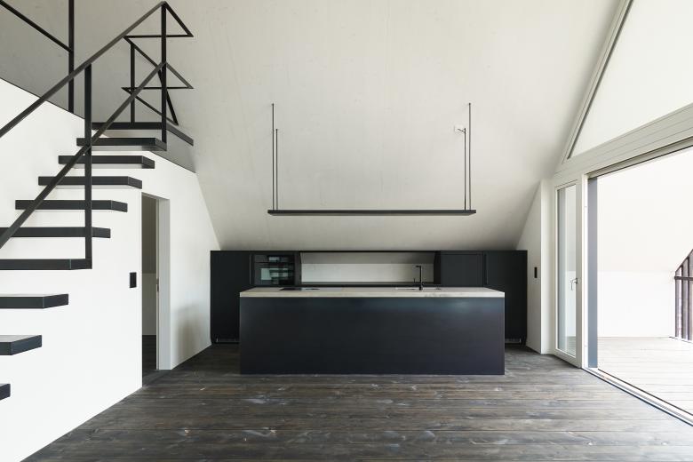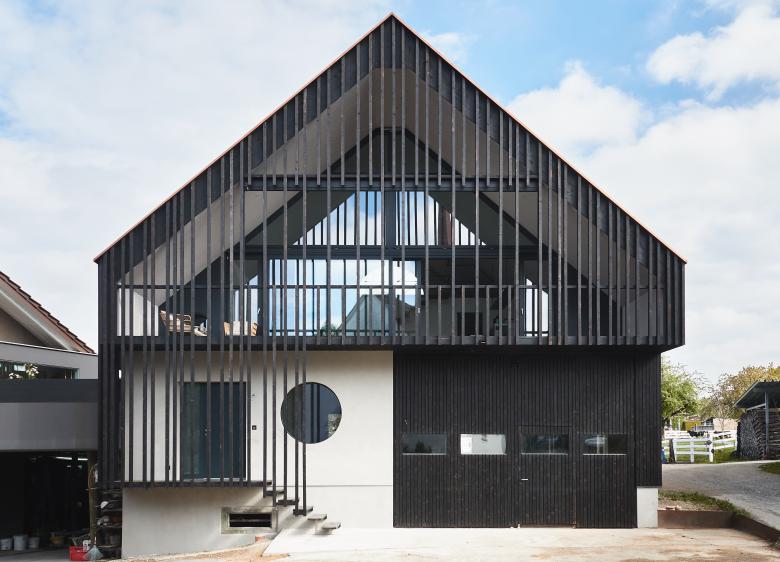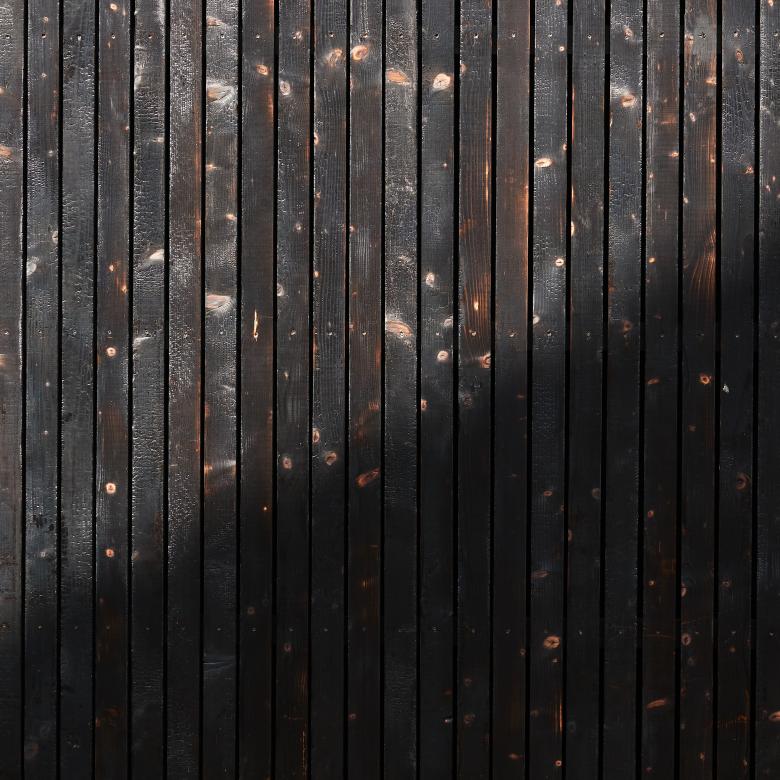 Die beinahe schwarze Fassadenschalung wurde mit einer traditionellen japanischen Methode, der «Yakisugi» (der Holzkonservierung) veredelt. Dabei wird das Holz durch leichtes Verkohlen der Oberfläche wasserabweisend und schützt vor Insekten- und Pilzbefall.