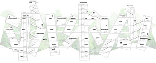 To minimize the visual impact on this prominent tropical forest, we have limited the site within a 56m-diameter. 12 mini towers ling on each other and embrace a tranquil platform polished from the rocky land. Inside this outdoor forum, visitors can rest, worship and hold events. Inside those towers, people  visit the museum, attend lectures and pray for their believes. Standing on the tops, one can overview the park, the sea and the beach. This is a memorial not only for commemoration of the disaster, but also for giving hopes to the livings and to our future generations.