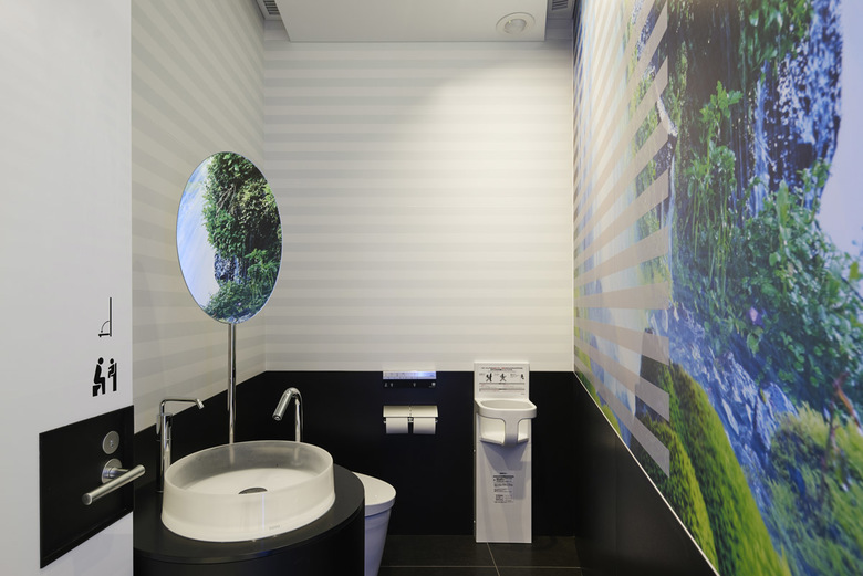 各ブース内は最新の衛生機器を導入し防汚技術素材のハイドロセラにプリントを施した壁面で風景のあるトイレ空間を実現した。退屈なトイレの待ち時間にもドアのタイムインジケーターが砂時計の様に刻々と変化する仕掛けで遊び心もプラスしている。