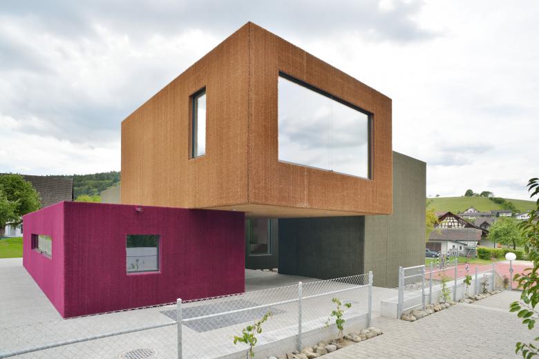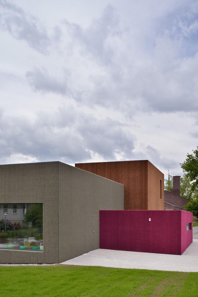 Der neue Kindergarten auf der Nordseite des bestehenden Klassentraktes ergänzt das Schulareal mit einem eigenständigen und zeitgemässen Baukörper, ohne dabei die grosszügigen Grundstücksreserven zu beanspruchen. Die klare Erschliessung und harmonische Anbindung an das bestehende Schulgelände ermöglichen eine intuitive und funktionale Nutzung. In vorfabrizierter Elementbauweise umgesetzt, überzeugt der Kindergarten durch eine markante Architektursprache, die sich bewusst vom Bestand absetzt, jedoch dennoch ein stimmiges Gesamtbild schafft. Die räumliche Abfolge von Eingang, Garderobe, Kindergartenraum, Spielecke bis hin zum Gruppenraum erzeugt ein dynamisches Raumgefüge, das durch kurze Differenztreppen zusätzlich belebt wird. Der oberste Raumkörper formt zugleich den geschützten Eingangsbereich und unterstreicht die durchdachte Verzahnung von Architektur und Funktion.