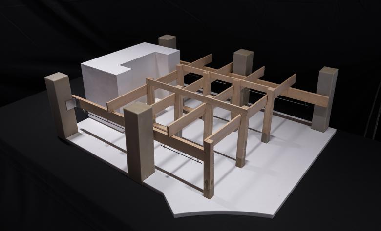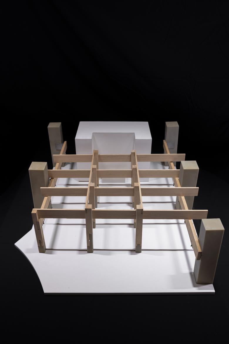 After extensive research and model studies of various joinery systems, four types were selected: the lateral-sliding “praying mantis” mortise from Nanchan Temple; a low, vertically interlocking cross mortise; a taller center-pinned palm mortise; and a more complex piece requiring a 45° spatial insertion path. These four systems differ in form, logic, and installation sequence, contributing to a rich layering of craftsmanship.