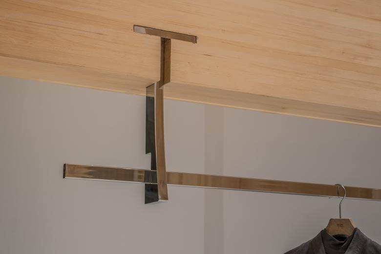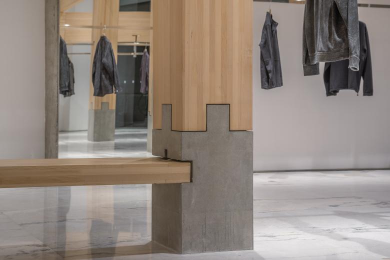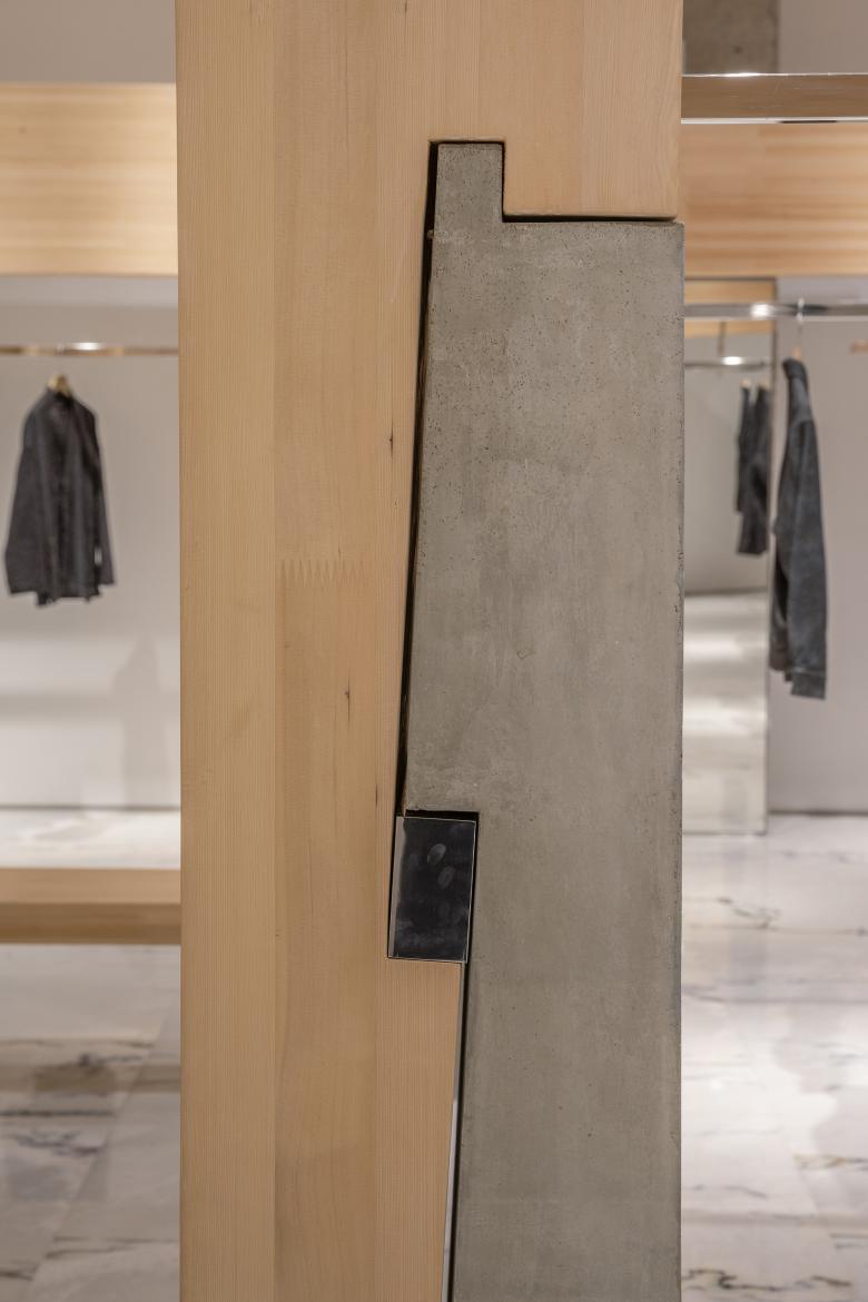 Traditional Eastern wooden architecture values the unity of furniture and structural logic. In this store, seating elements are joined into the concrete column recesses using mortise-and-tenon methods, becoming part of the structural system. Hanging rods are integrated by pre-cutting mortises at the columns and inserting metal rods through a tenon-like maneuver—creating a consistent construction language from macro to micro scales.
