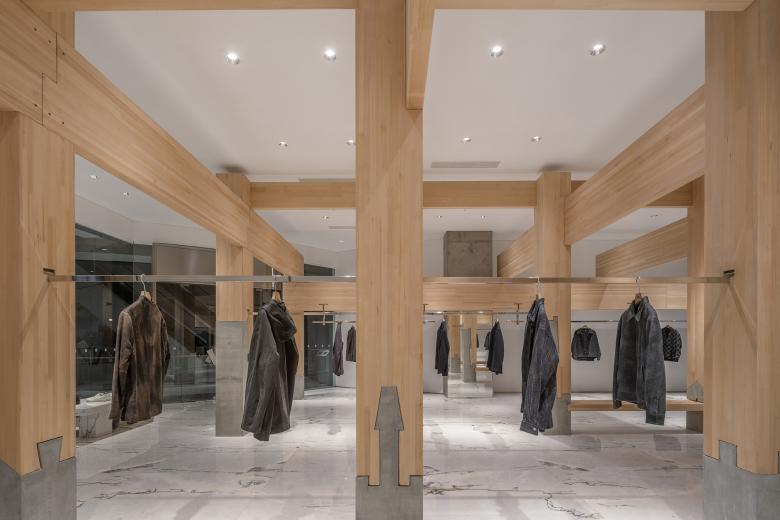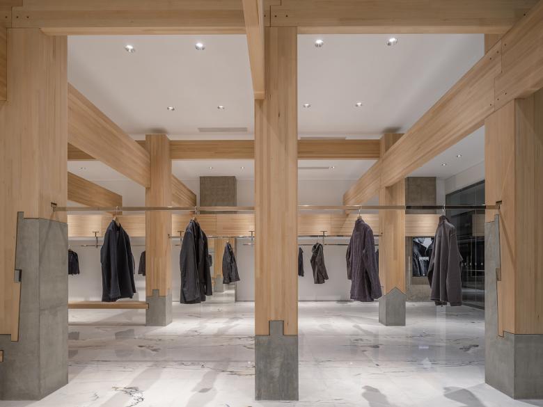 The project is located within a contemporary commercial complex, whose building structure is a reinforced-concrete frame. Within this industrialized system, a traditional timber frame is grafted to evoke the lineage of Shanxi’s wooden architecture in a contemporary retail setting. Based on the store’s existing structural grid, a “three-bay, four-span” composition is adopted. The central bay naturally generates an axial sequence for the entrance, seating zone, cashier, and main visual backdrop, while the two side bays host long hanging rods for displaying garments. The suspended clothes further emphasize the linear qualities of the beams and columns.