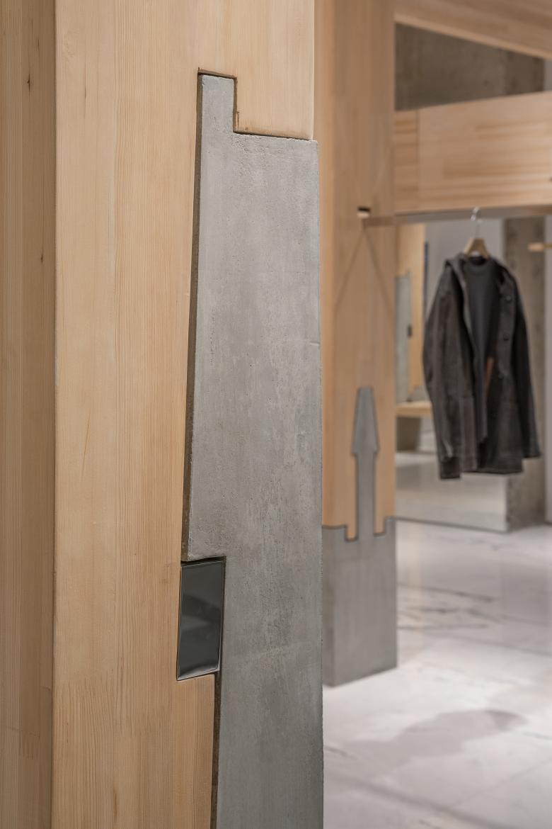 Thus, this space for DANNONG was never intended simply as “a clothing store.” Stripped of all garments, the space should first exist as a contemporary artwork with tangible materiality, order, and spirit—constructed through genuine materials, precise joints, and a restrained rhythm. All materials are treated with respect, echoing the epistemic attitude of traditional timber construction.