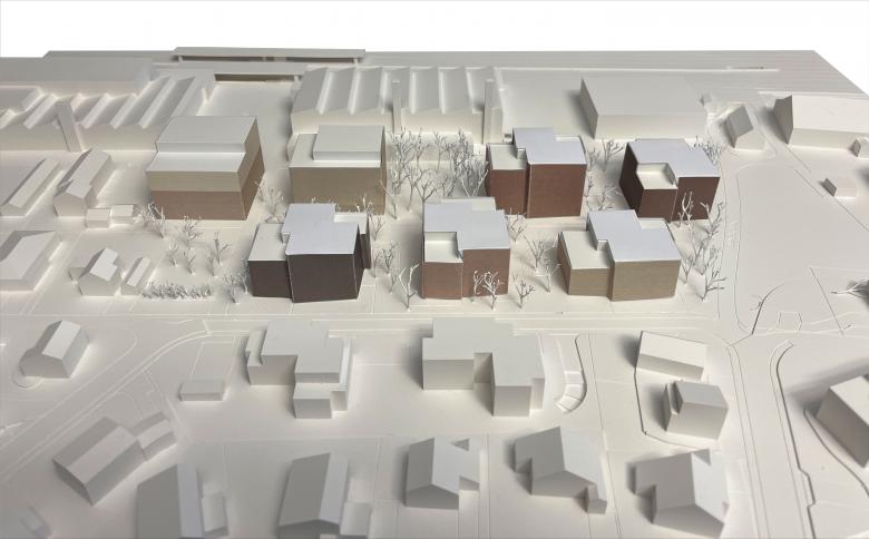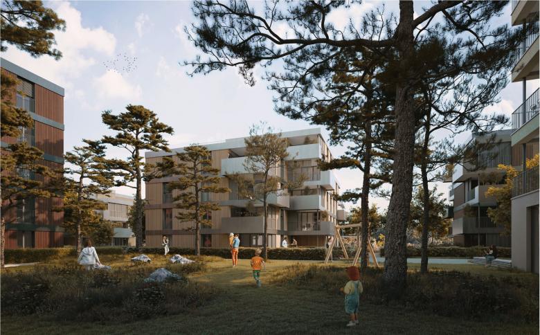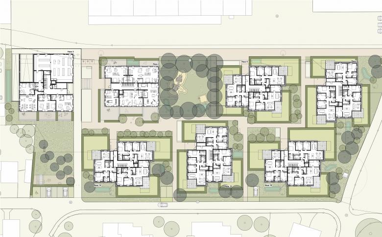 Die Höhenentwicklung verändert sich vom hohen 6-geschossigen Haus 2 am hinteren Bahnhofplatz bis zum 4-geschossigen Haus 10 in Richtung Landwirtschaftszone und in Richtung Einfamilienhäuser. Im Innern des Salzhofes zwischen den punktförmigen Wohnhäusern wird die Atmosphäre von den Gärten und den Wohninseln geprägt. Diese knüpft an die Wohnsituation bei den Einfamilienhäusern an: Privatheit im eigenen Garten mit Blick über die Hecke ins Quartier und zum Nachbarn. Durch die optimierte Anordnung der Gebäudekörper werden Aussenflächen freigespielt, die sowohl privat als auch