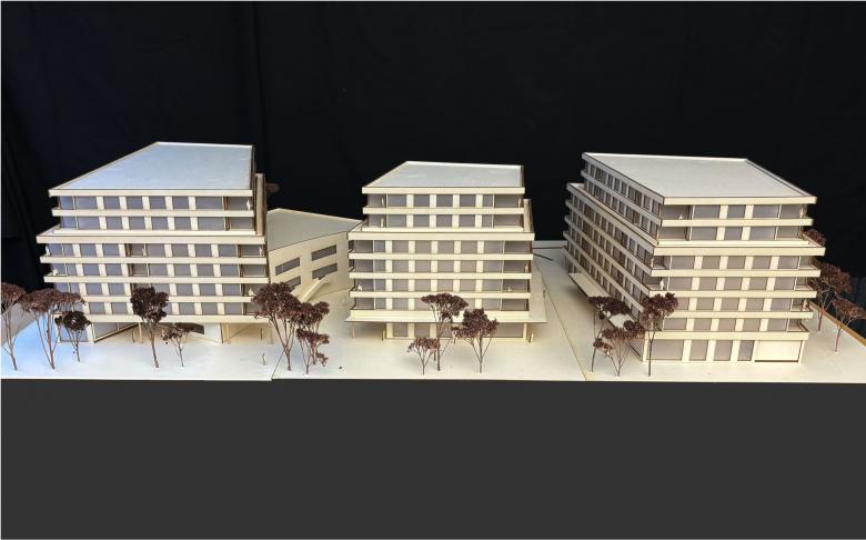 Unser Projekt «Zweien» schafft ein dichtes Raumgefüge zwischen dem Geleisefeld und der Ron, dort wo die Strasse nach Buchrain und der Veloweg aus dem Untergrund auftauchen.