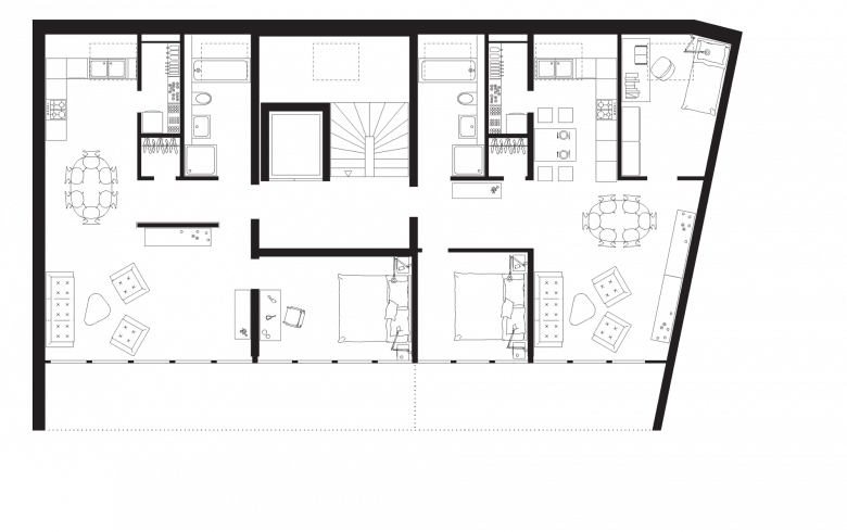 Auf einem schwierigen, dreieckig geschnittenen Grundstück im Großraum Frankfurt steht dieses Mehrfamilienhaus, dass verschiedene Wohnungsgrößen kompakt organisiert. Die Fassade nimmt die charakteristischen Auskragungen der umliegenden Fachwerkbebauung auf. Gleichzeitig spart das Gebäude mit sonstigen Details und präsentiert sich als moderner Solitär.