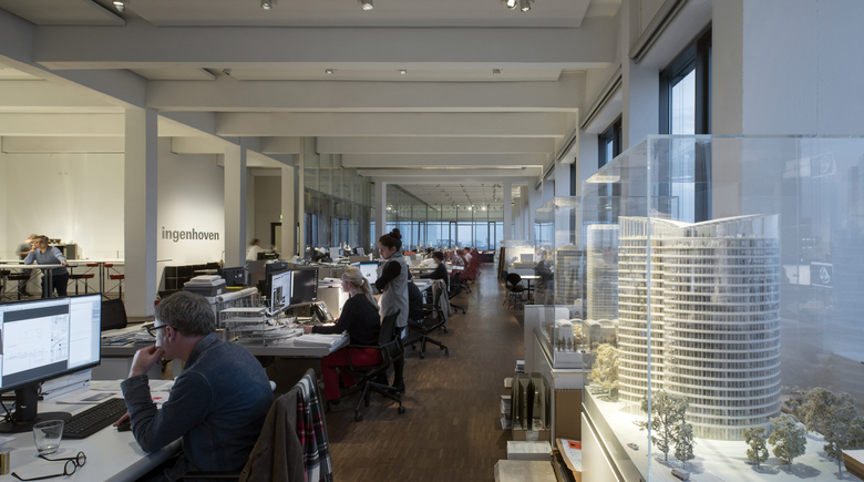 Sculptural facades, long quay walls and listed warehouses characterize the appearance of Düsseldorf's Media Harbour. The offices of ingenhoven architects are located in the midst of this urban environment — a...