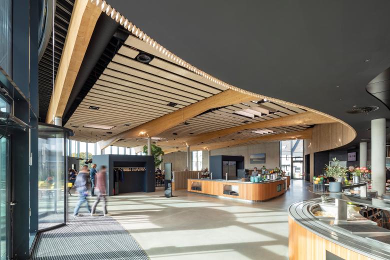 Mit ca. 400 Sitzplätzen bietet das Restaurant etwa 1.000 Mahlzeiten pro Tag an. Eine hohe Aufenthaltsqualität wird durch die gelungene Kombination aus Sichtbeton und Holz im Innenbereich des Restaurants geboten. Besonders erwähnenswert ist die Tatsache, dass die Räumlichkeiten mechanisch be-/entlüftet sowie gekühlt werden können. Die Fassade des Gebäudes besteht aus Holz und das begrünte Vordach im Außenbereich lädt im Sommer zum Verweilen ein.