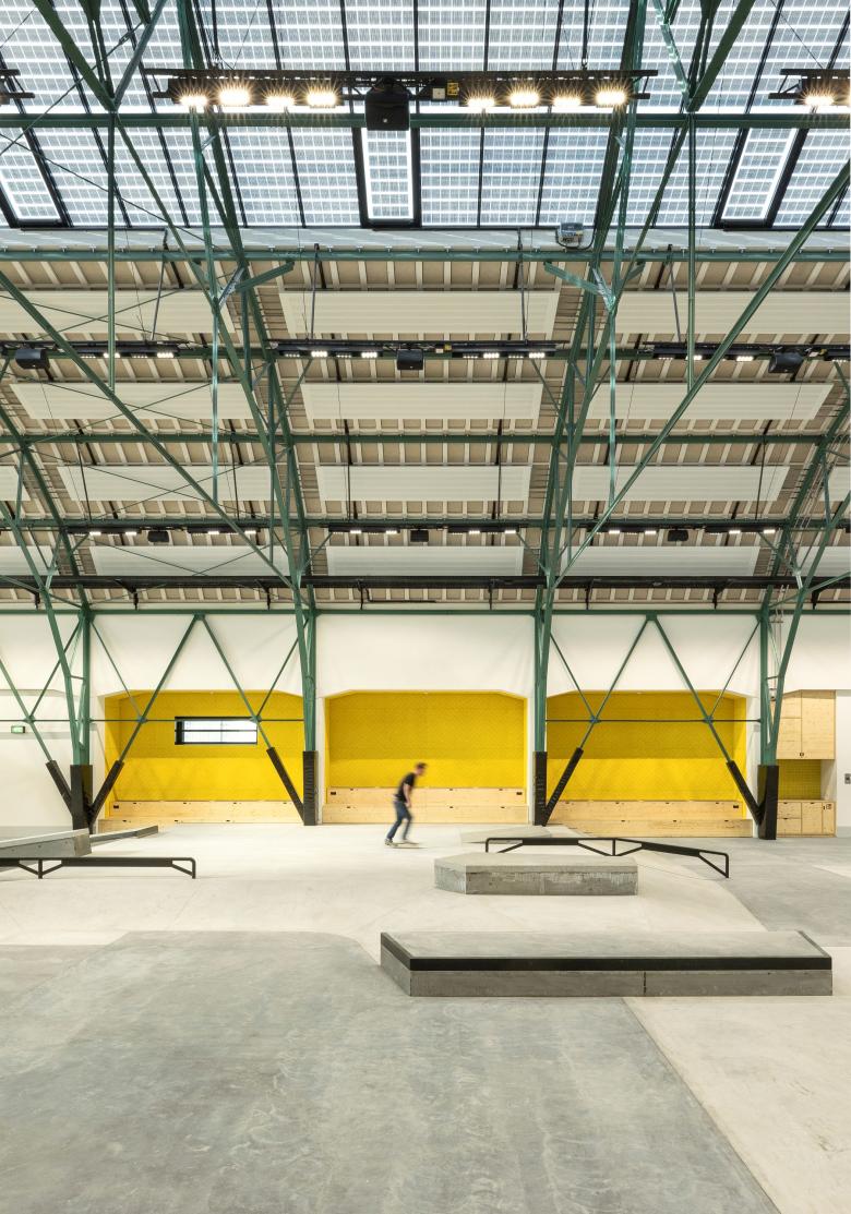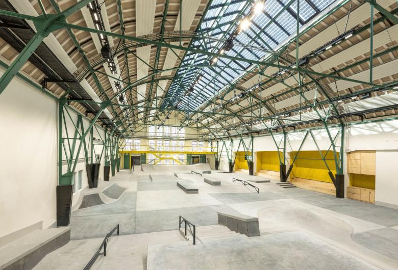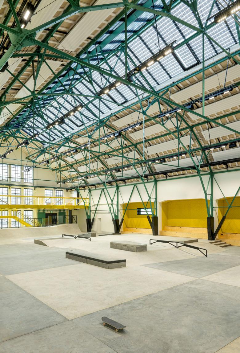 The scheme integrates and expands the heritage-listed Eggenfabrik - a long-vacant, turn-of-the-twentieth-century factory. Its gabled facades, expansive windows, and delicate steel frame were preserved, creating a striking contrast with the contemporary elements of the skate and BMX zones. A new gallery level serves as a lounge and event space with views of the action below, while niches along the west wall offer seating and storage directly connected to the sports area.