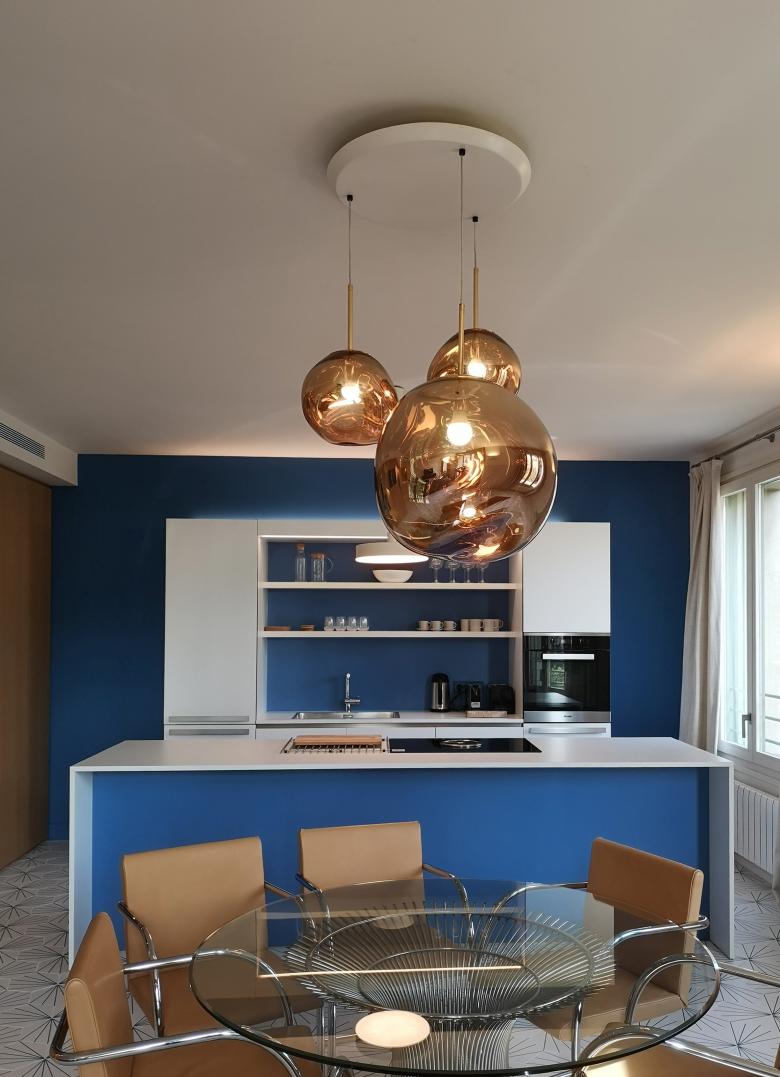 The interior design preserves and restores traditional architectural elements such as the Catalan volts in the ceilings and hydraulic tiles on floors, as well as opening up the spaces to make the most of the brightness and the pleasant weather of Barcelona. The overall white palette is broken up with interesting features like bespoke shelved walls which divide the spaces without closing them up, walls painted in trendy green and blue hues and a careful selection of exquisite Catalan and Scandinavian furniture.