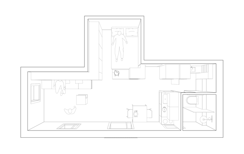 The live in the apartment is experienced in different ways regarding how many people is in it. Therefore the furniture must be flexible and take advantage of the most storage space possible of it. Below the bed, there’s space enough to store a bicycle and a surf board. In front of it, a pivoting shelve can turn into a privacy filter. At the living room the sofa is also a drawer and depending on the pillows disposition , can turn into an extra bed.