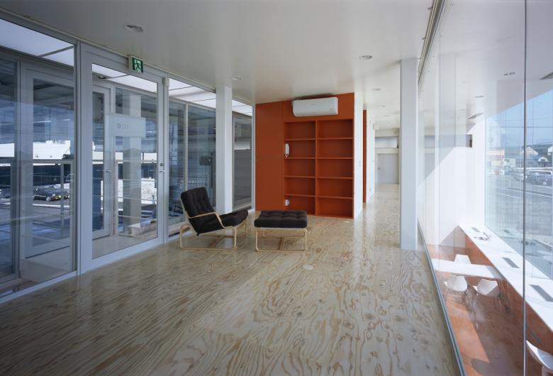 This auto repair shop located in Niigata, a large Japanese city, provides space where clients can repair their own cars in addition to standard services. Most buildings in the suburbs of Niigata are characterized either by strong colors and fanciful forms, or monotonous designs in grey or beige. With this project, we tried to create an interesting design without getting caught up in the local competition for “most fanciful building.”