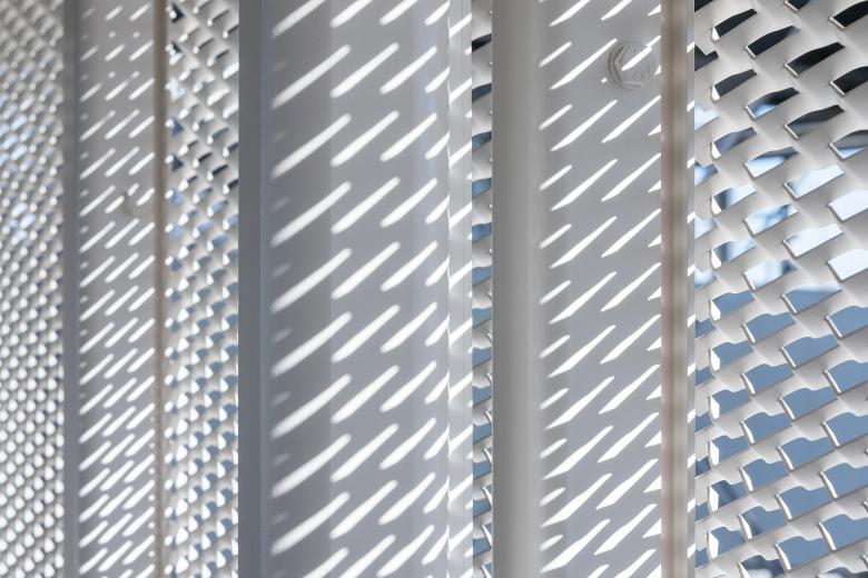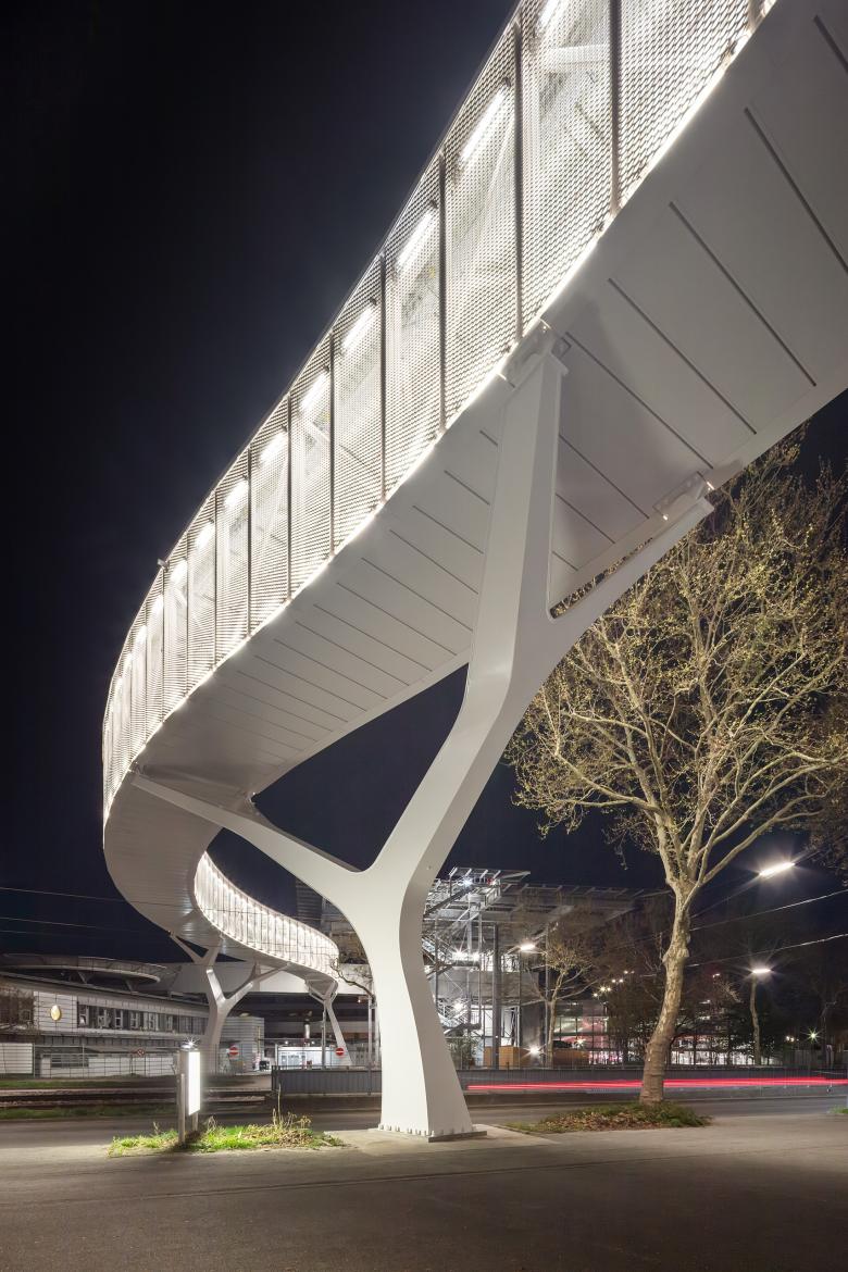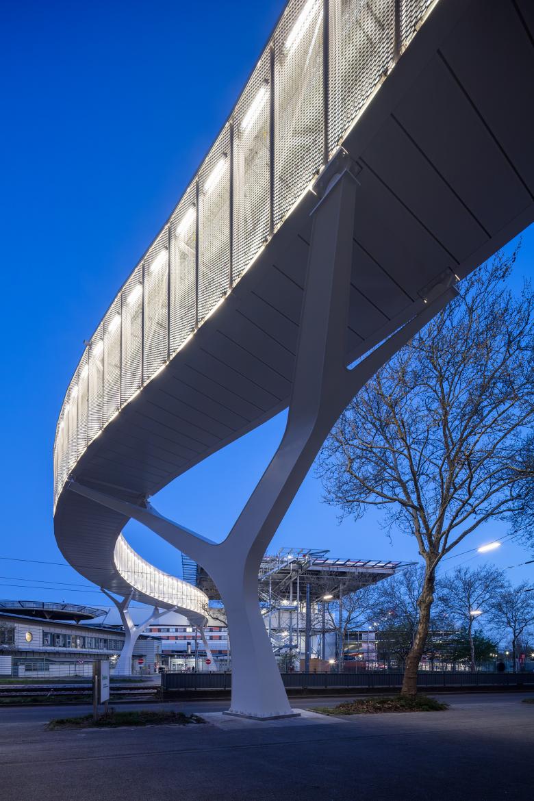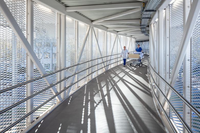 Die offene Fassade besteht aus weißlackierten Streckmetallelementen mit differenzierter Perforation. Im unteren und oberen Bereich der Paneele sind die Öffnungen geschlossener, zur Mitte hin weiten sie sich auf, so dass sie bei ausreichender natürlicher Belichtung des Überwegs die nötige Diskretion für die Patient:innen bieten. Die Transluzenz der Fassade ändert sich mit Lichtsituation, tagsüber ein weißes Band, zeigt die Brücke im Gegenlicht oder von innen beleuchtet, ihre Konstruktion, Bewegung ist schemenhaft sichtbar. Doch an erster Stelle steht der reibungslose Ablauf des Transports, so sind an jeder Stelle die lichte Durchgangsbreite und -höhe von 2,50 Metern gegeben, am Anschluss an den Erschließungsturm der Hubschrauberplattform gibt es eine Aufweitung, um das Manövrieren mit den Transportbetten zu erleichtern. Vor den Türen und den konstruktiven Elementen werden Rammschutz und Handläufe montiert. Wir haben die Brücke ebenso minimal wie präzise geplant, in der offenen Konstruktion hat alles seinen Platz, seinen Sinn. Hier ist kein Raum für Dekor, die Ästhetik entsteht aus dem Unmittelbaren, dem Hochfunktionalen, jeden Tag und jede Nacht, rund um die Uhr.