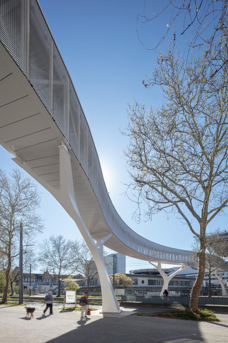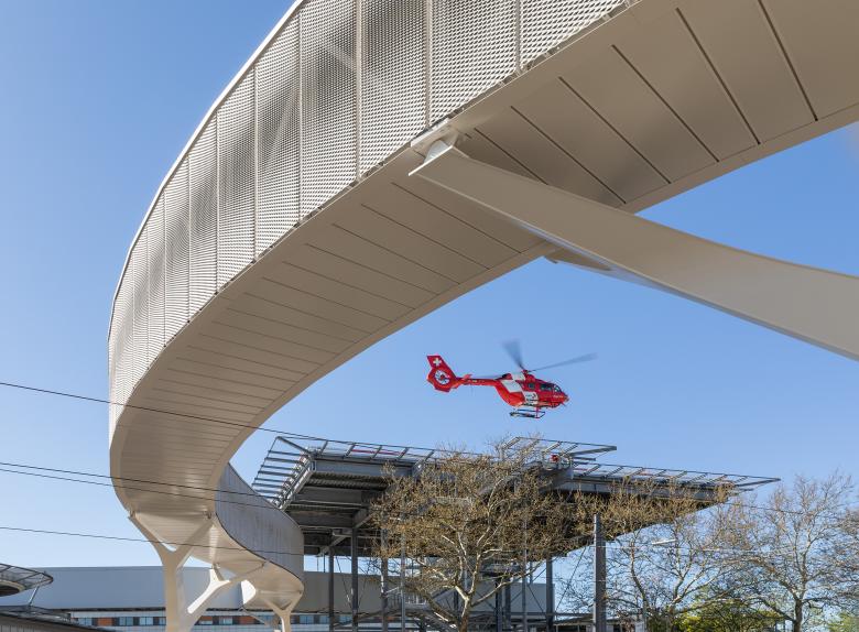 Die 80 Meter lange Brücke dockt auf Höhe des zweiten Obergeschosses über dem Haupteingang der Helios Klinik an und überquert die Straße auf gleichem Niveau bleibend. Auf der Klinikumseite schließt sie an den Treppen- und Aufzugsturm des freistehenden Helipads sowie die Zentrale Notaufnahme an. Der Straßen- und Schienenbereich bleibt durch die weiten Auskragungen der Stahlrohr-Gabelstützen stützenfrei. Stahlbau ermöglicht eine schlanke, wirtschaftliche und langlebige Konstruktion des Überbaus. Dessen leicht geschwungenen Flanken sind als Fachwerkträger mit schlanken Pfosten- und Diagonalstäben geplant, zwischen den Ober- und Untergurten spannt jeweils ein Verband, der die erforderliche horizontale Steifigkeit des Überbaus erzeugt. Die Montage des Überbaus erfolgte nach Errichtung des Treppenhauskerns am Helipad und der Gabelstützen segmentweise. Die vier vorgefertigten Elemente sind zwischen 19 und 25 Meter lang und wurden als Schwertransporte zum sofortigen Einbau auf die Baustelle geliefert.