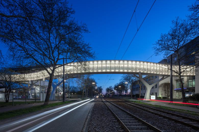 Es muss einfach gehen und schnell. So plante das Städtische Klinikum Karlsruhe den Neubau eines Helipads und einer Verbindungsbrücke zwischen Landeplatz und Klinikum und der auf der gegenüberliegenden Straßenseite gelegenen Helios Klinik. Im Sommer 2020 haben wir uns gemeinsam mit Werner Sobek an dem für den Neubau der Brücke ausgelobten Wettbewerb beteiligt und konnten mit Ästhetik und hoher Funktionalität überzeugen. Mit leichtem Schwung überspannt die Brücke die vier Fahrspuren der Franz-Lust-Straße sowie das in der Mitte liegende Gleisbett der Straßenbahn. Auf jeder Straßenseite fügt sich eine Gabelstütze mit weiten Auskragungen in die Platanenallee ein, eine weitere steht vor dem Helipad. Darauf liegt ein tagsüber weißer, nachts illuminierter Fachwerkkastenträger, der mit einer leichten S-Kurve den idealen Weg findet und damit einen Raum für den sicheren und zeitsparenden Überweg schafft. Im Stadtbild ist die Brücke an dieser Stelle kein Fremdkörper, ihre zeitgemäße und dynamische Gestaltung fügt sie in den Verkehrsraum ein und präsentiert sie als ein wichtiges, weil verbindendes Element zwischen den beiden Krankenhäusern.