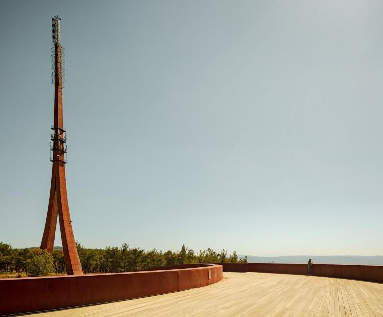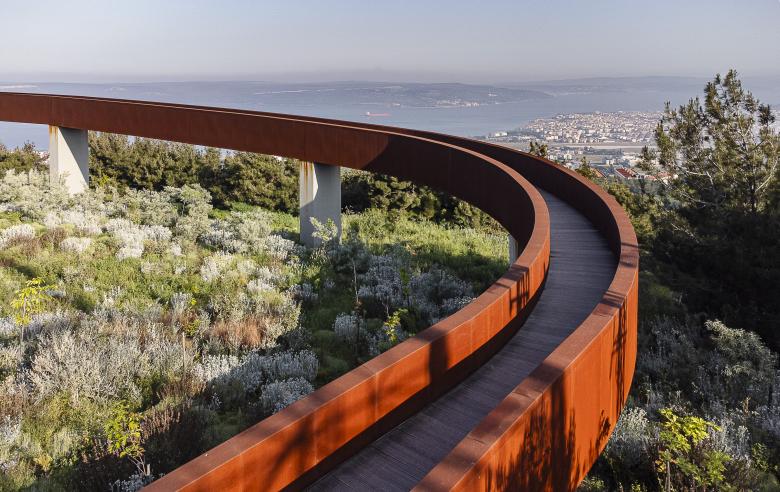 The tower stands proudly at the entrance, while the public facilities are placed at the opposite end, capitalizing on the stunning surrounding views of Çanakkale – city and seaport in Turkey’s Marmara region. A fluid outer band seamlessly connected these elements, offering visitors awe-inspiring vistas of the ancient Dardanelles. The loop's design artfully evolved into a tall entrance canyon, a wide viewing terrace deck, an elevated viaduct, and finally, the broadcast tower itself. The architectural intervention extended beyond aesthetics, nurturing a beautiful inner garden. Here, indigenous flora is showcased, and eroded land is rejuvenated with healthy soil and young forest trees. The park, deliberately designed to exude a natural and untamed ambiance, blurs the boundaries between the plot's vegetation and the surrounding forest landscape. A remarkable intervention that harmonizes technical design with environmental consciousness, while transforming the landscape into a public haven.