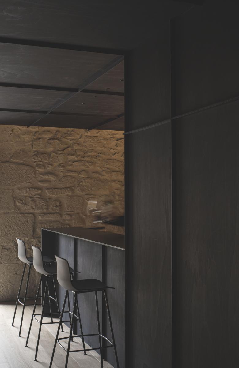 Un diseño en el que un nuevo y sobrio juego de materiales coexiste con la historia del lugar sin pretensiones de transformarlo todo. El denominador común más importante del proyecto ha sido la conservación de las paredes de sillería sobre las que se ha aplicado una pátina monocromática gris clara para unificar el tono. Esta técnica también pretende dotar de cierta luminosidad a las estancias, donde el grueso de los muros muchas veces no facilita la entrada de luz natural. Por otro lado, y contrastando con la claridad de la piedra y los suelos en roble natural, está la madera de chopo negra que recorre el espacio, integrando la iluminación y escondiendo aparatos técnicos tales como los altavoces. Este color también se vincula emocionalmente con pilares y vigas rehabilitadas de un tono oscuro.