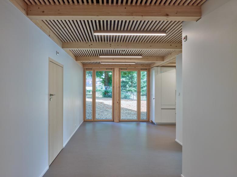 La première étape de réalisation du concours se concentre sur la partie d’accueil de l’enfance. La structure d’accueil préscolaire se place sur un niveau à l’extrémité Sud-Est, éloignée du trafic. La structure d’accueil parascolaire est, elle, prévue comme étage supplémentaire sur le même volume. Cette extension bénéficie d’une placette arborisée dans la continuité de la place de Longereuse, ainsi qu’un espace extérieur plus paisible pour la structure préscolaire à l’Est, au fil de l’Areuse.