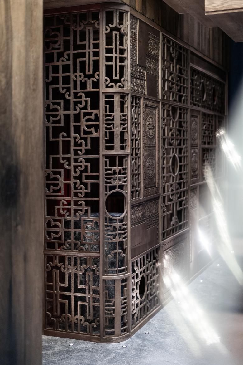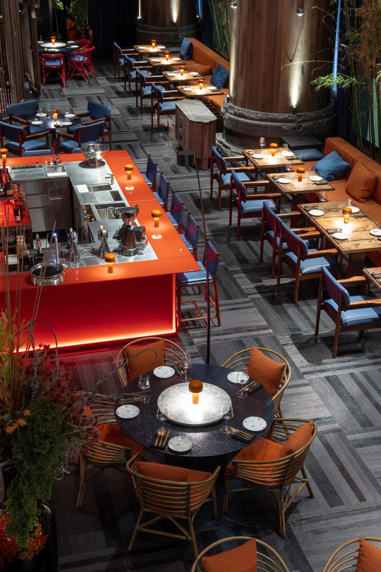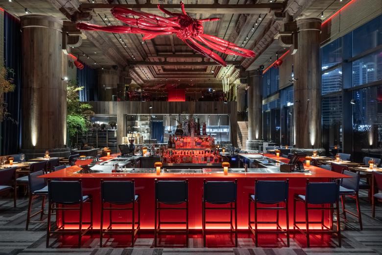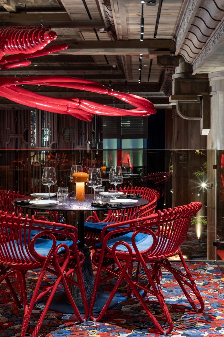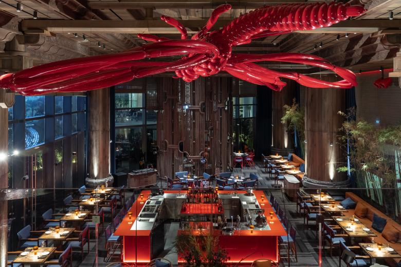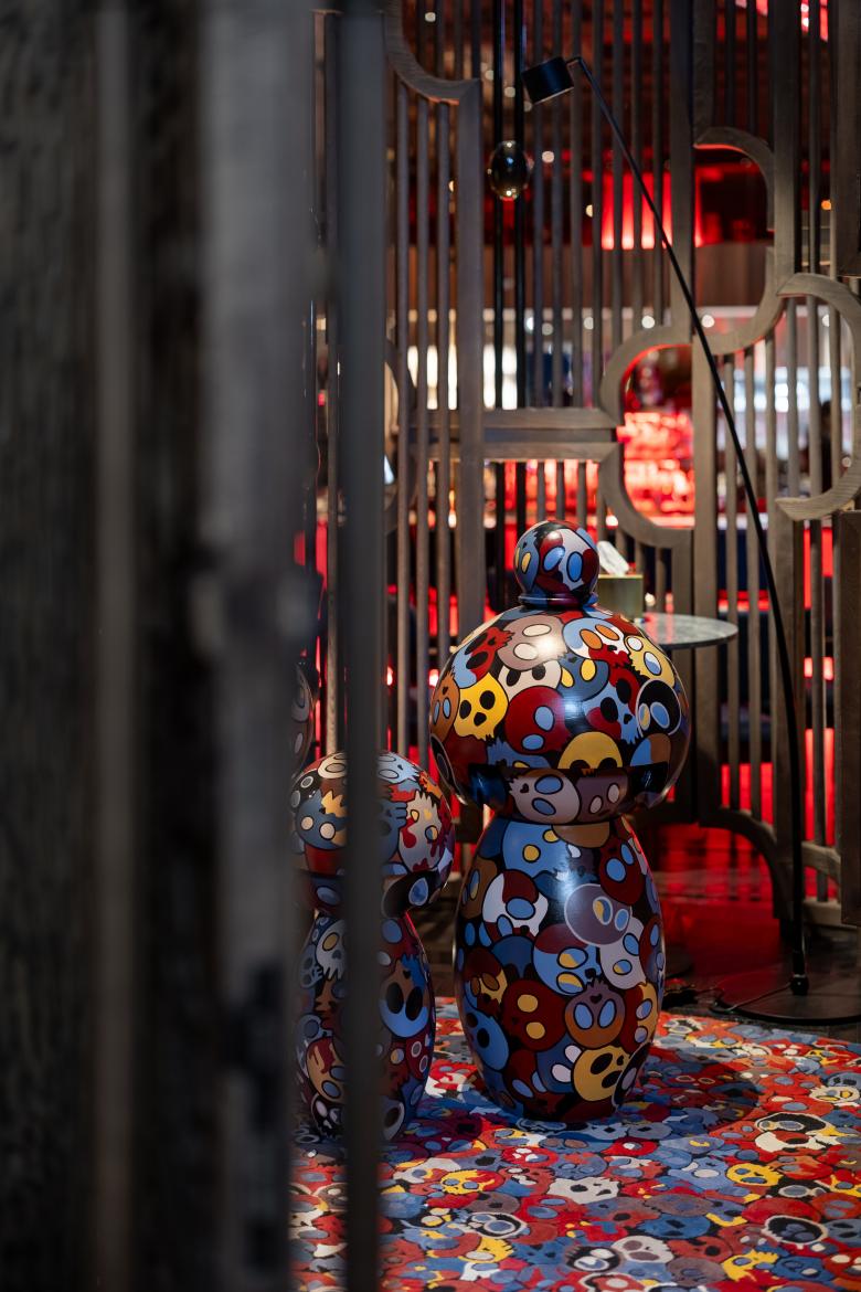 A 360-degree glass bar crowned by a 9-meter dragonfly sets the dramatic tone. Hand-carved columns, vintage vases, and kokeshi dolls ground the space in cultural symbolism. We integrated modern hospitality features like a mezzanine DJ booth and open kitchen. High-quality materials—wood veneer, granite, and leather—underscore the craftsmanship. The result is a visually striking, emotionally engaging space that fully delivers on the client’s vision.