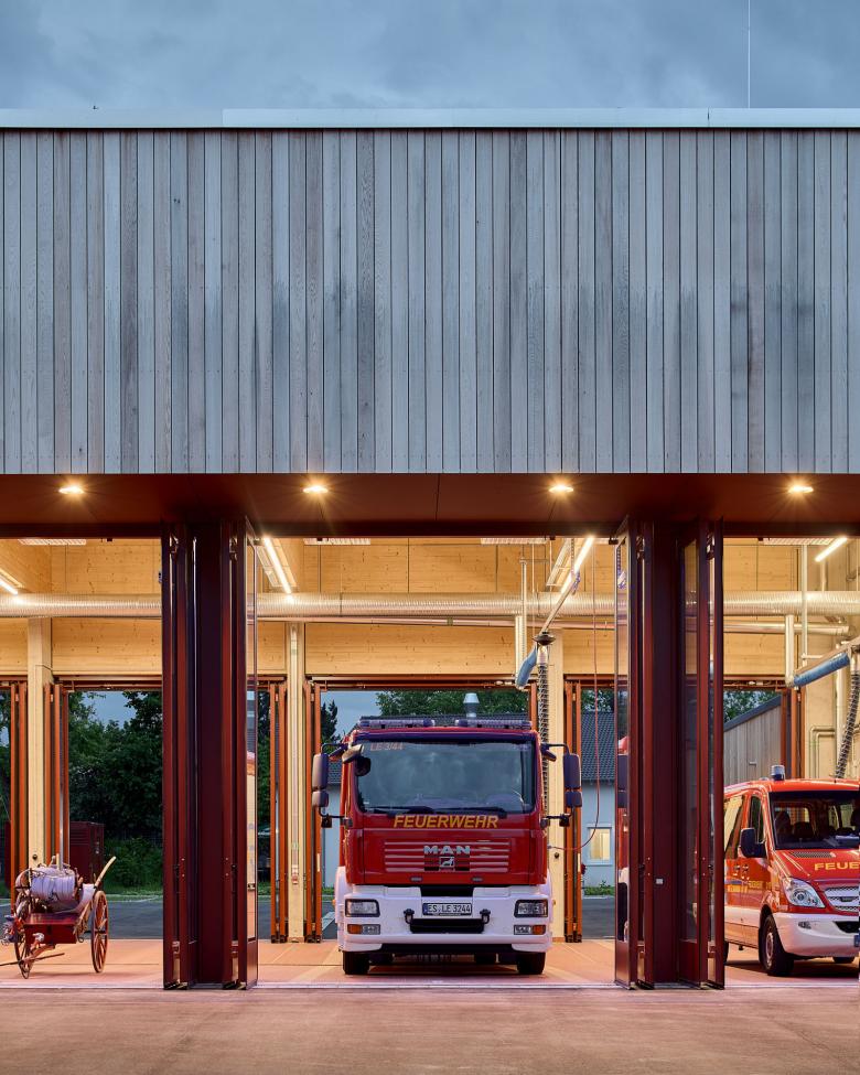 One can only plan so much in any architectural photography assignment. There are always elements out of one's control that require managing. Along with the city planners and Glück + Partner Architects, we planned to shoot during the "golden hour" and after the national elections as party candidate placards peppered the entire street. With a promising weather prognosis, I set off on a 2-hour drive with much optimism. Weather can play a significant part in any photographic scene. Of course, the weather took a turn for the worse. I spun the situation on its head and embraced the incoming summer storm. I acted spontaneously and quickly depending on where the sun broke through or when dramatic rain clouds formed, composing the sky and building together to create an atmosphere of theatre and excitement, which conformed well with the work of the volunteers at the Fire and Red Cross Station.
