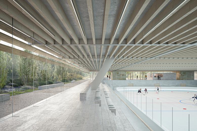 Die geplante Eissporthalle St. Moritz wird mit besonderem Fokus auf Nachhaltigkeit und Kreislaufwirtschaft entwickelt. Das Projekt setzt auf eine einladende und funktionale Architektur, die durch die Verwendung ressourcenschonender Materialien und Techniken überzeugt. Die Eissporthalle wird von einem überhoch ausgeführten Fachwerkträger überspannt, in dessen Aufbauhöhe sich die Parkierungsgeschosse befinden, wodurch das gebaute Volumen optimal ausgenutzt werden kann. Als Sekundärstruktur wird ein Holz-Beton Hybridsystem eingesetzt, was die Erstellungsemissionen reduziert und gleichzeitig eine hohe Tragfähigkeit und Langlebigkeit sicherstellt. Die Fassade wird aus einheimischen, rohen Hölzern gefertigt, was den Verschnitt reduziert und zur regionalen Materialnutzung beiträgt. Es kommt in der Fassade als Vollholz ohne Verleimungen zum Einsatz und wird mit Schraubverbindungen montiert, wodurch es leicht in den Kreislauf zurückgeführt werden kann und auf natürliche Weise CO2 speichert.