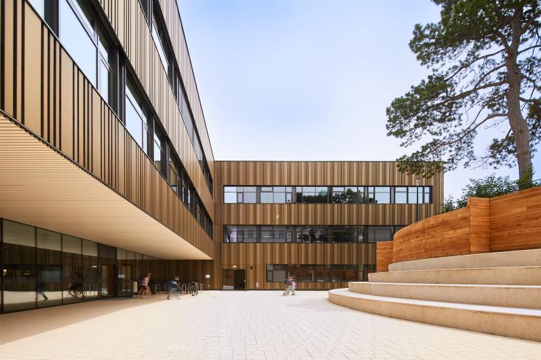 Der neue identitätsstiftende Platz unterstreicht nicht nur den Campusgedanken, er bietet darüber hinaus eine hohe Aufenthaltsqualität und lässt sich funktional mit dem im Eingangsgeschoß liegenden Aula- und Mehrzweckbereich zu einer großzügigen Fläche mit dem dahinterliegenden Garten verbinden, als neuer Raum für Schulfeste, die Ausstellung öffentlicher Projektarbeiten, Theaterworkshops etc.
