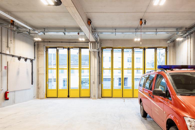 Drei rote Feuerwehrfahrzeuge stehen hier bereit, um jederzeit aus der Halle zu rücken. Rückwärtig angrenzend stehen die ebenfalls roten Garderoben. Sichtbeton dominiert ansonsten das Erscheinungsbild des Inneren der Halle. Als nicht brennbares Material vermittelt es den Eindruck von Sicherheit. Links der Halle regelt ein hohes Einfahrtstor den Zugang zum Innenhof, wo die Mitarbeiter ihre Fahrzeuge parken sowie ihre Einsätze üben können. Rechts der Halle weist ein Fassadensprung auf die dahinter liegenden niedrigen Nebenräume hin.
