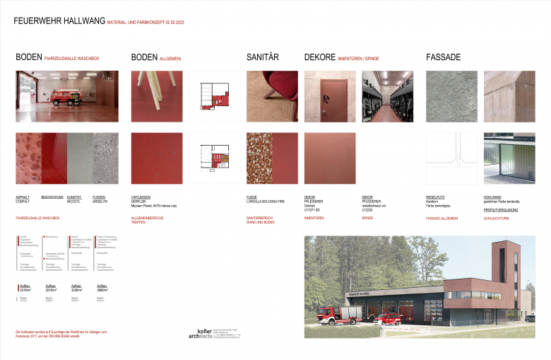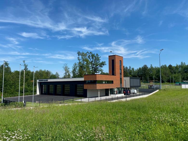 Zum anderen die zweigeschossige Fahrzeughalle. Im vorderen Bereich bietet sie Platz für fünf Fahrzeuge, während im hinteren Bereich die Lager- und Technikräume untergebracht sind. Im darüberliegenden Geschoss befinden sich der Gruppenraum, der Schulungsraum und die Räume der Feuerwehrjugend. Die Halle ist in schlichtem Grau gehalten.