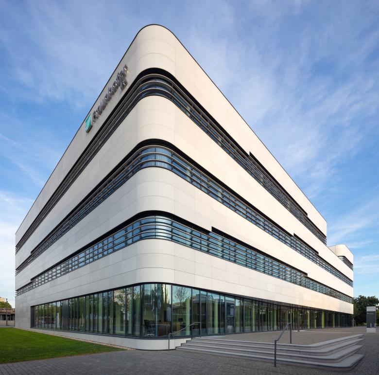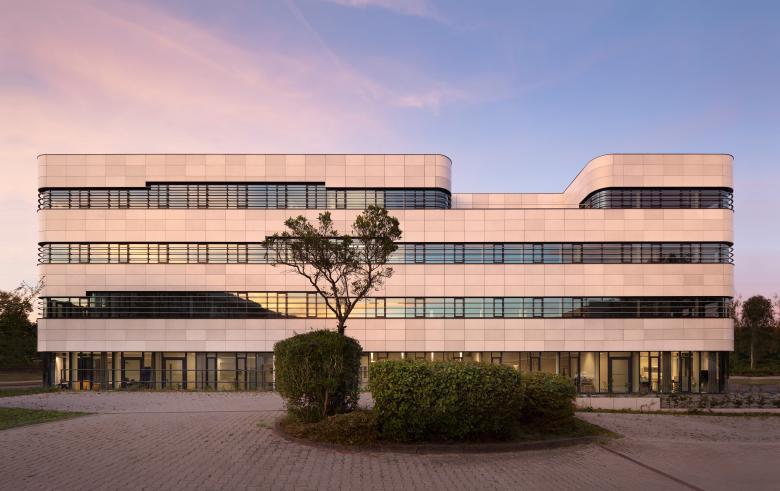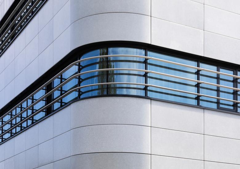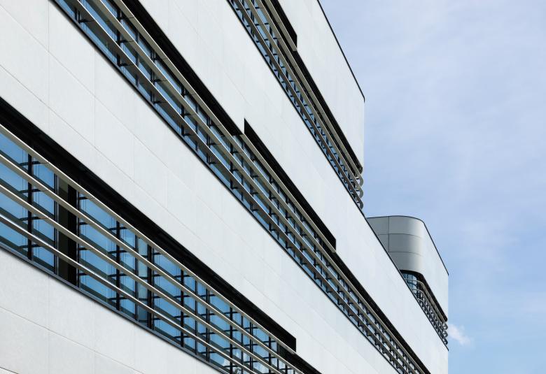 Die fließenden, horizontalen Linien der Glaskeramik-Fassade geben dem viergeschossigen Gebäude Dynamik und Leichtigkeit. Die Fassade aus recyceltem Glas aus Abfällen der Solarzellenproduktion passt nicht nur zur Forschungstätigkeit des Instituts; sie ist auch nachhaltig.