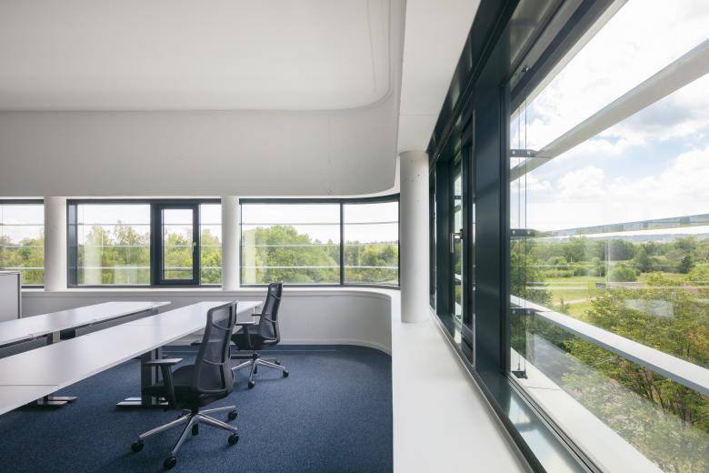 Innen entstehen moderne und helle Büros, Seminarbereiche, Labors sowie eine dreigeschossige Forschungshalle. Durch die kompakte Struktur sind die Wege zwischen den Bereichen kurz und kommunikationsfördernd. Auch die großzügigen Dachterrassen schaffen Raum für Begegnungen und fördern eine zeitgemäße, kooperative Arbeitsatmosphäre.