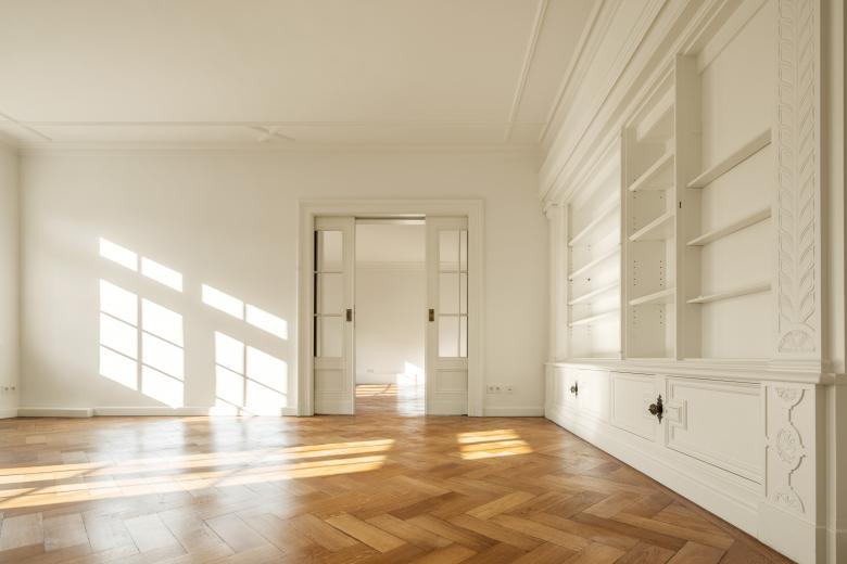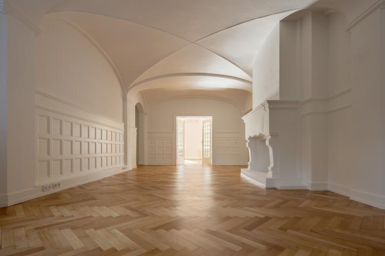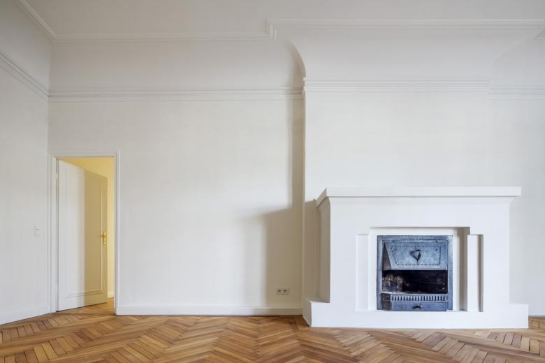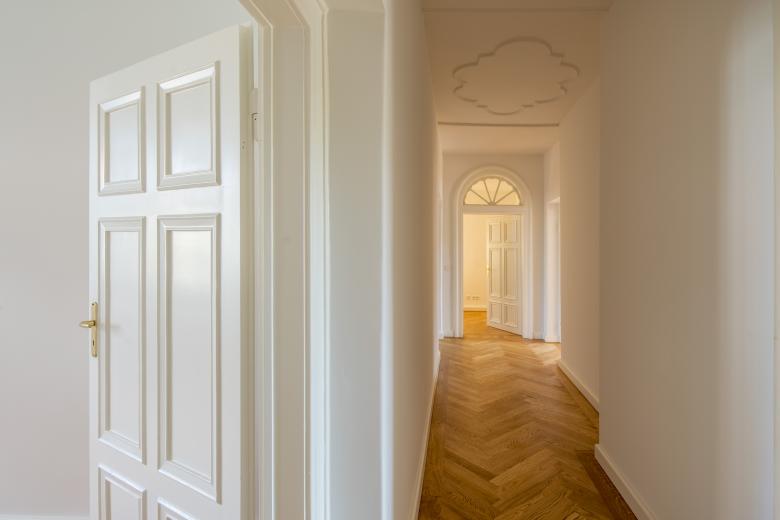 Im Bestand wurde das Fischgrät Bestandsparkett aufgearbeitet und in Teilen mit massivem Eichenparkett ergänzt. Die Wände haben Putzoberflächen; Stuckornamente wurden behutsam saniert und ergänzt. Soweit wie möglich wurden die bestehenden Kassettentüren und Sprossenfenster aufgearbeitet, andernfalls in gleicher Bauart ergänzt.