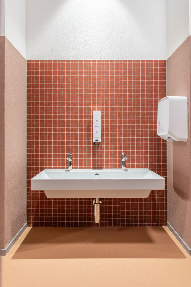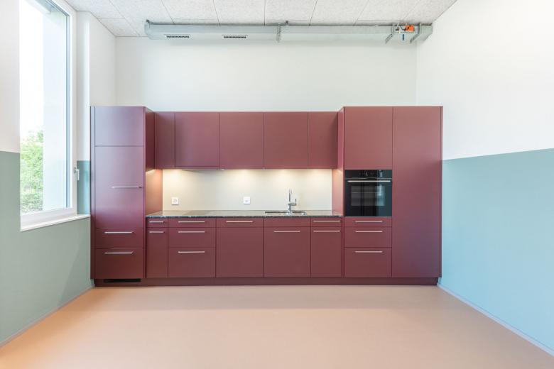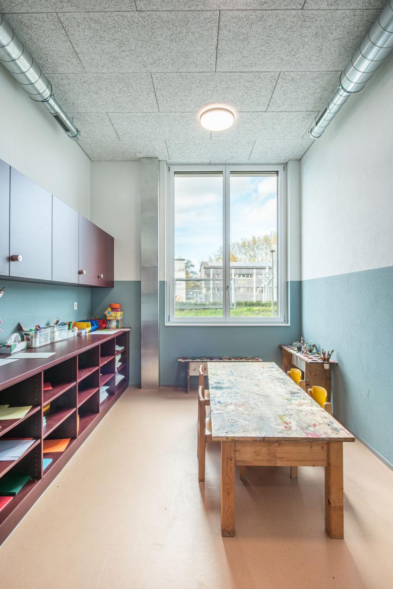 Die Kita ist klar strukturiert und gut auffindbar erschlossen. Sie umfasst drei Spielgruppen mit jeweils zugeordneten Nebenräumen und wird durch einen Gemeinschaftsraum, einen Bewegungsraum und einen Werkraum ergänzt. Eine interne Verbindung über das Treppenhaus ermöglicht den Bezug von Mahlzeiten aus dem Restaurant des Pflegezentrums. Mit ihrer abgestuften Volumetrie vermittelt die Kita zwischen den unterschiedlichen Nutzungen und trägt wesentlich zu einer familienfreundlichen Quartierentwicklung bei.