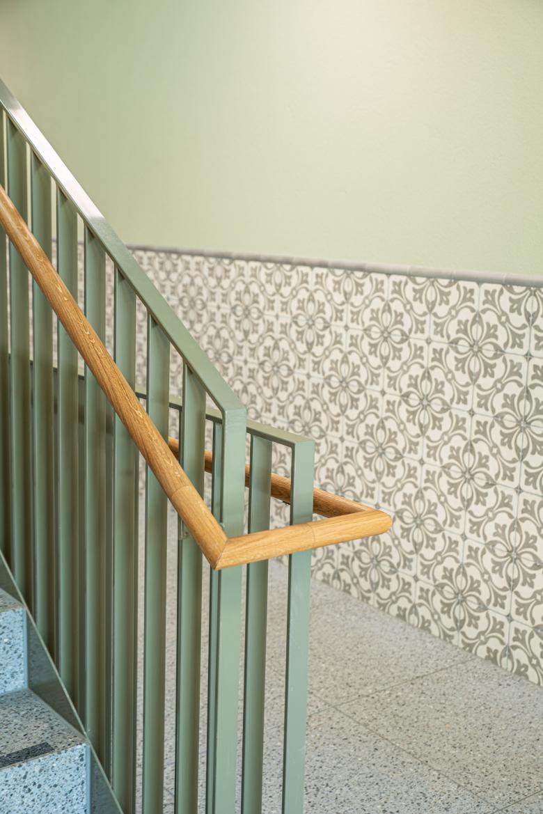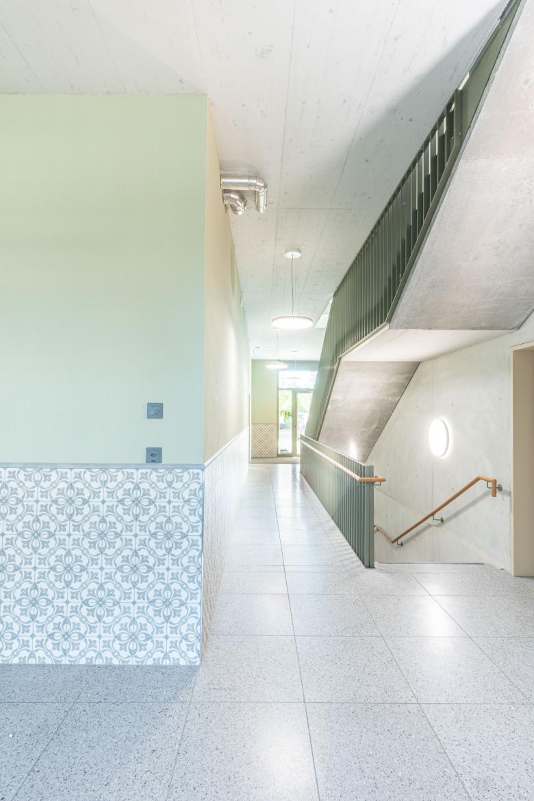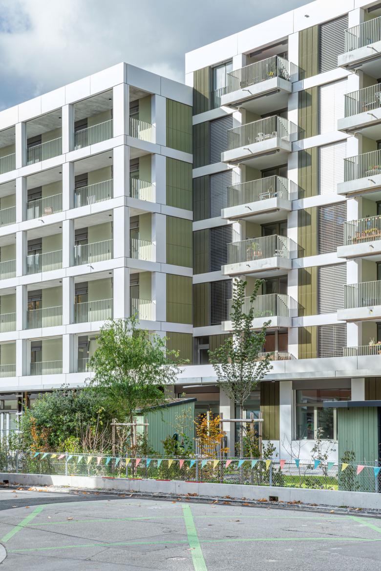 Im östlichen Gebäudeteil entstanden 34 gemeinnützige Mietwohnungen für Menschen mit bescheidenem Einkommen. Das Erdgeschoss beherbergt die städtische Kita und öffnet sich mit dem spielerischen Aussenraum zum Quartier.
