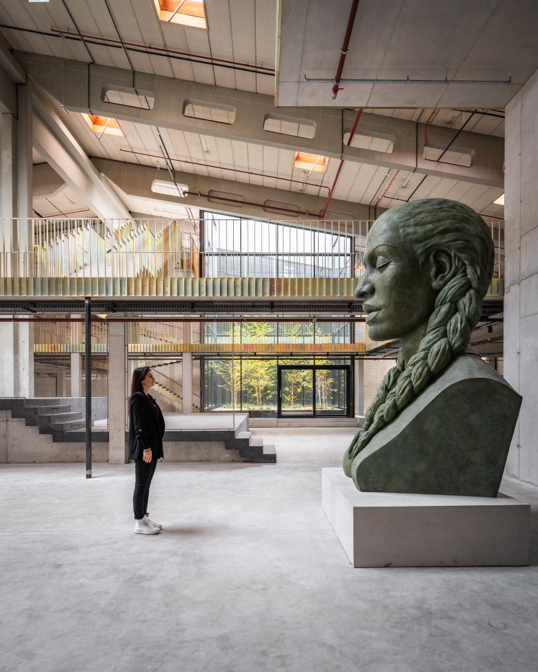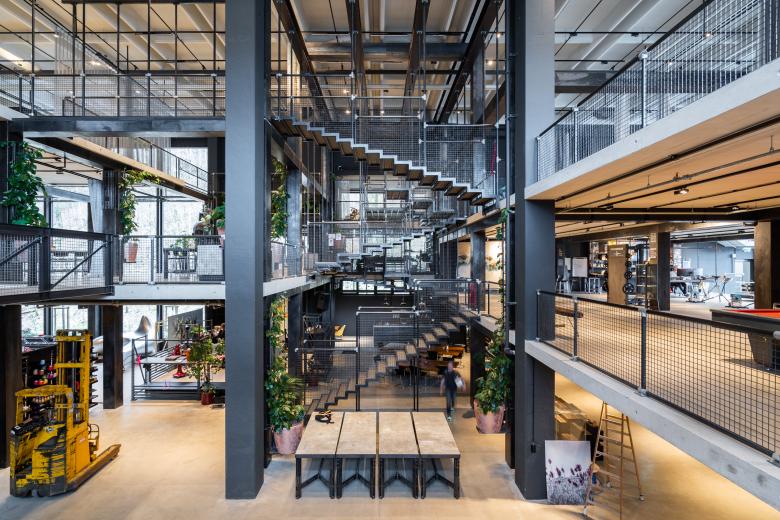 Once the halls have been emptied, their full potential is revealed. Enormous room heights, raw materials and large column grids become visible. Compared to a classic office building, these parameters create incredible flexibility for use – and great scope for exciting architecture. The depths of the hall combined with small façade areas create a difficult lighting situation, which is responded to with minimally invasive architectural interventions. Generous atriums cut into the existing roof bring daylight and in fact a real outdoor space into the center of the warehouse.