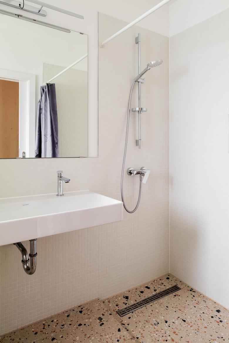 Das Obergeschoss blieb in seiner kleinteiligen Struktur weitestgehend erhalten. Dort befinden sich drei Schlafzimmer sowie ein weiteres Arbeits- und Gästezimmer. Eine Leichtbauwand wurde versetzt, sodass ein zusätzliches kompaktes Bad mitsamt Garderobe am Elternschlafzimmer entstanden ist.