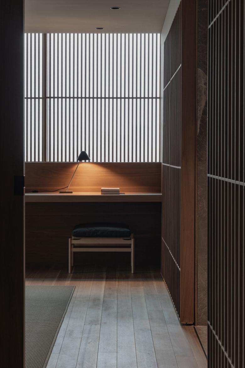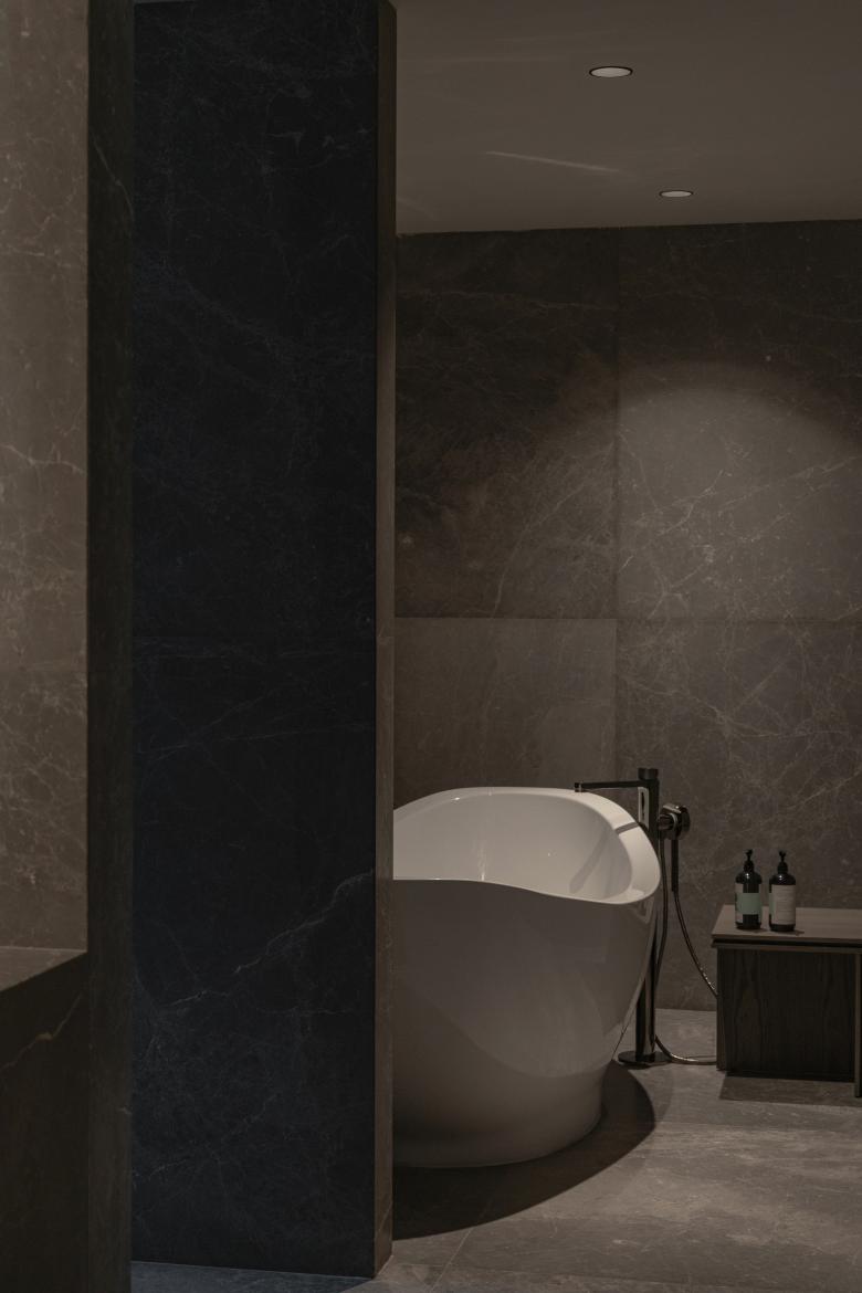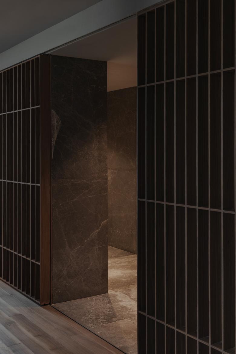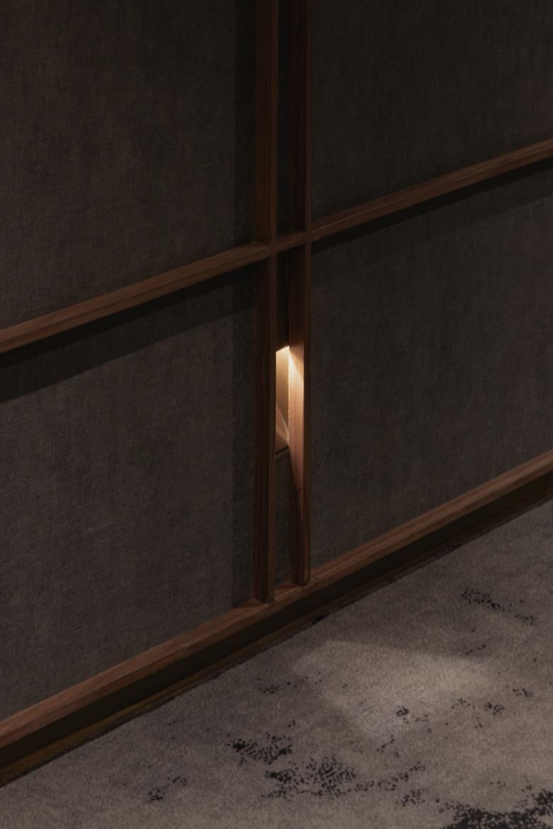 Las habitaciones, definidas por un lenguaje de líneas característico del estudio, prolongan la paleta táctil general. Existen siete tipologías distintas, todas marcadas por la repetición, la coherencia formal y la integración de los elementos. Los armarios se ocultan tras tiradores alargados que se transforman en lamas, reforzando la idea de continuidad. Los suelos alternan madera, piedra o moqueta según el tipo de estancia, mientras los pasillos se revisten con tejidos que mejoran la acústica y aportan una serenidad perceptible en el recorrido.