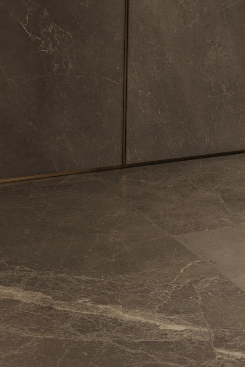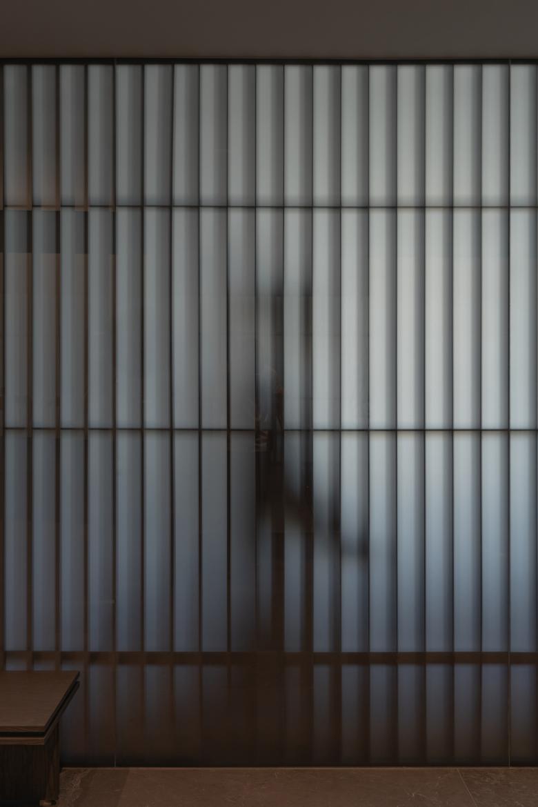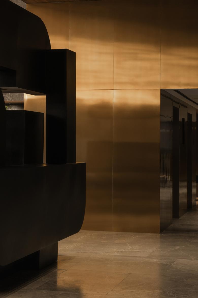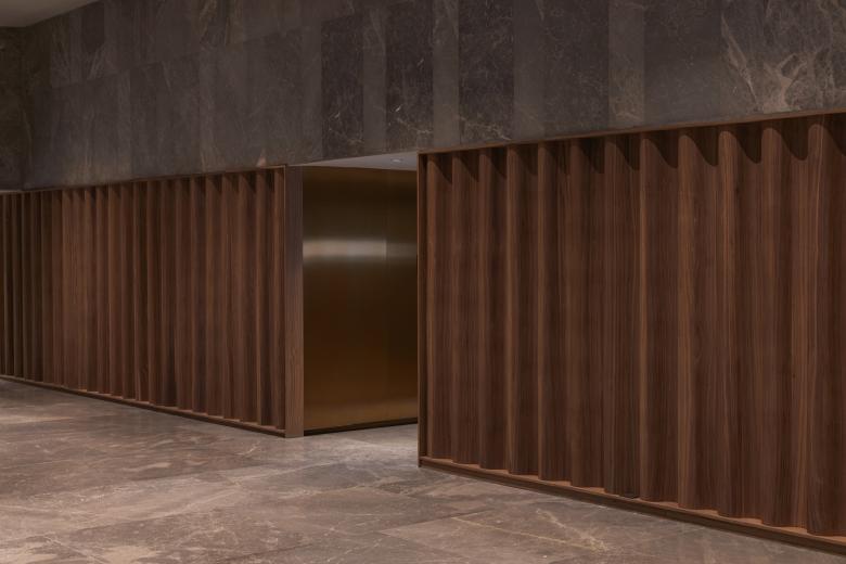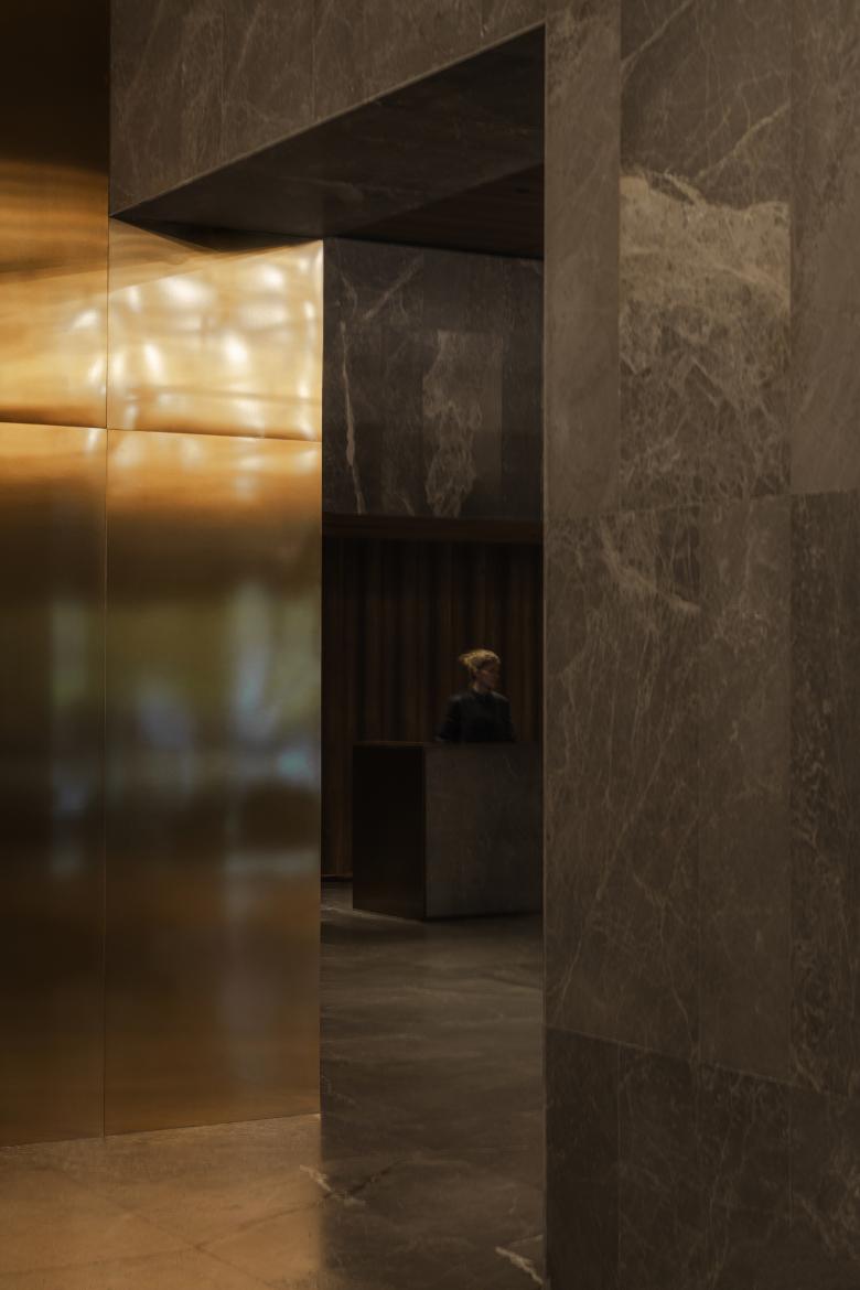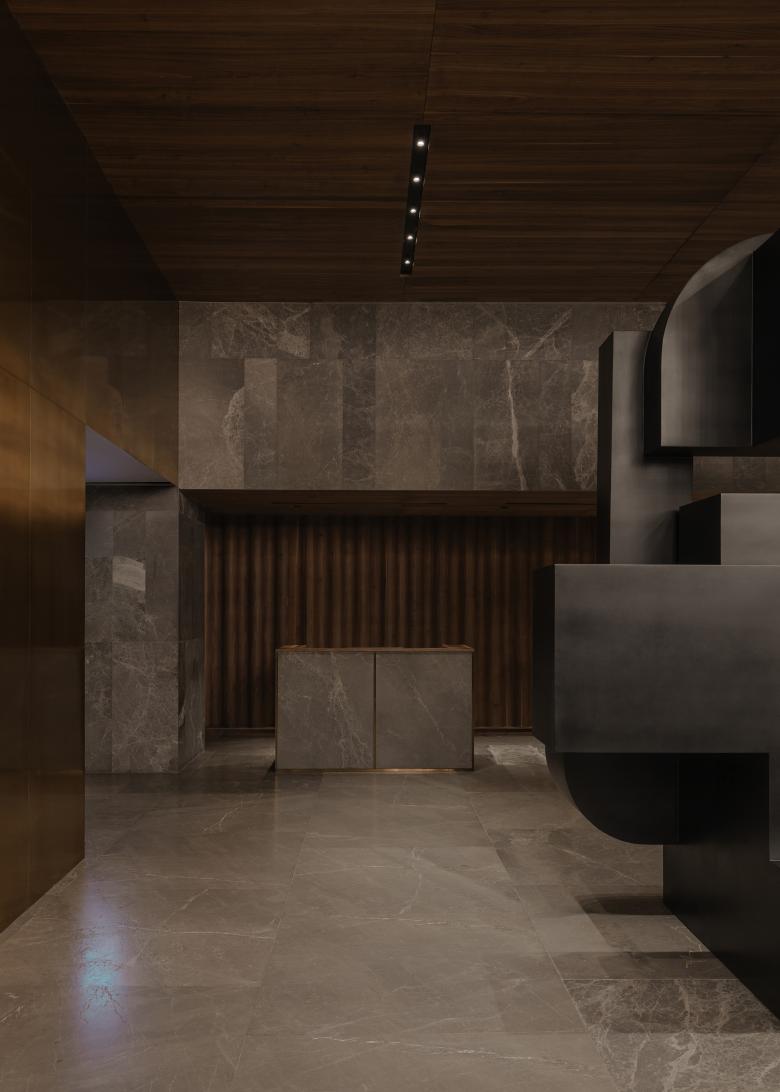 A pesar de su altura y presencia urbana, la arquitectura se ha concebido para sentirse cercana y habitable. Cada proporción y cada encuentro han sido diseñado para equilibrar la monumentalidad con una percepción más doméstica del espacio. En el vestíbulo, las superficies pétreas y metálicas conviven con planos de madera que actúan como contrapunto cálido. Los tres volúmenes de recepción se ocultan tras una gran escultura, de modo que la primera impresión del visitante es la de un salón doméstico. En él, una obra del artista Stefan Brüggemann se extiende sobre un banco longitudinal de piedra Rochelle, aportando una tensión silenciosa a través de sus reflejos y escala.