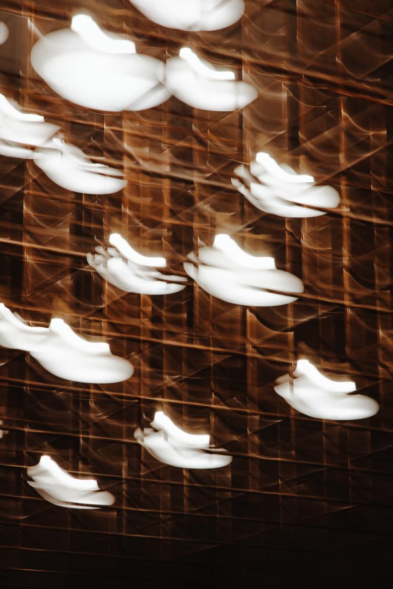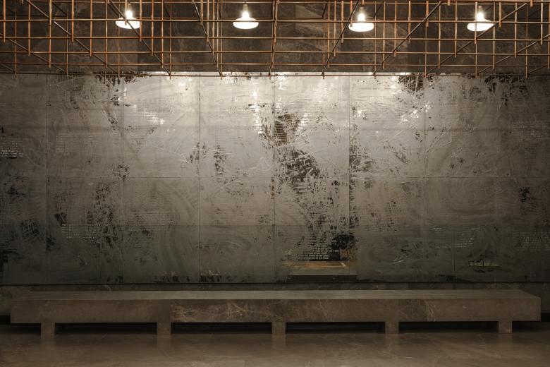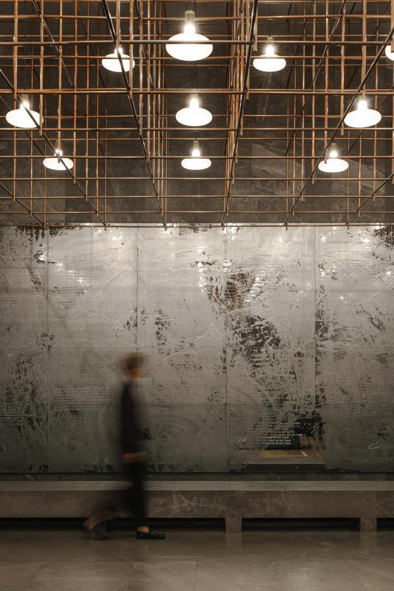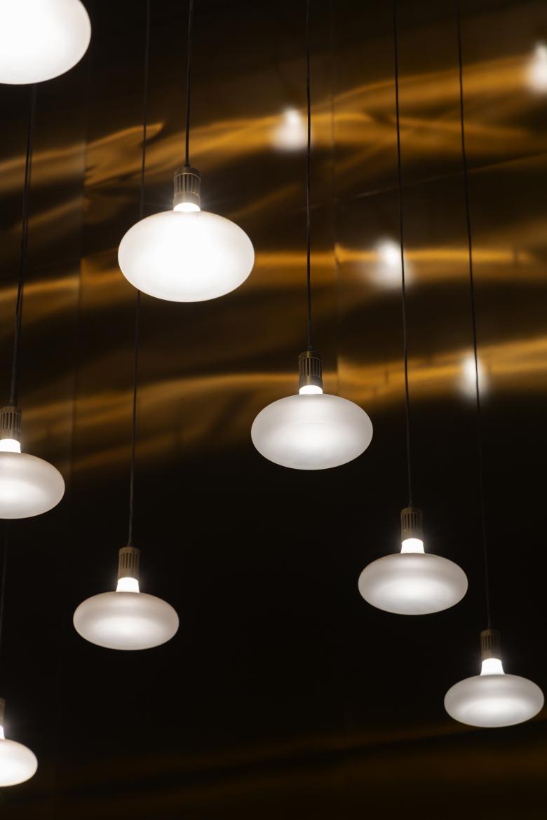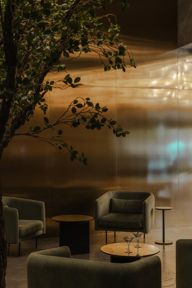 Sobre este espacio, una estructura suspendida organiza la iluminación: una cuadrícula de varillas metálicas que acoge un conjunto de lámparas dispuestas con aparente aleatoriedad. Este gesto introduce ligereza y ritmo, creando un cielo artificial que contrasta con la densidad mineral del suelo. Suspendida como una nube precisa, la estructura equilibra el peso del edificio con una sensación de movimiento contenido. Desde allí, el vestíbulo se abre hacia el Epicentro Mixology Bar, definido por paramentos de latón y una vegetación que introduce una nota orgánica frente a la geometría metálica.