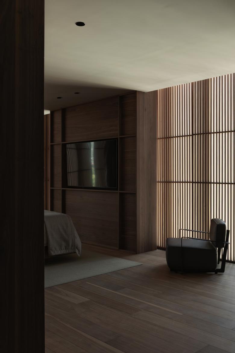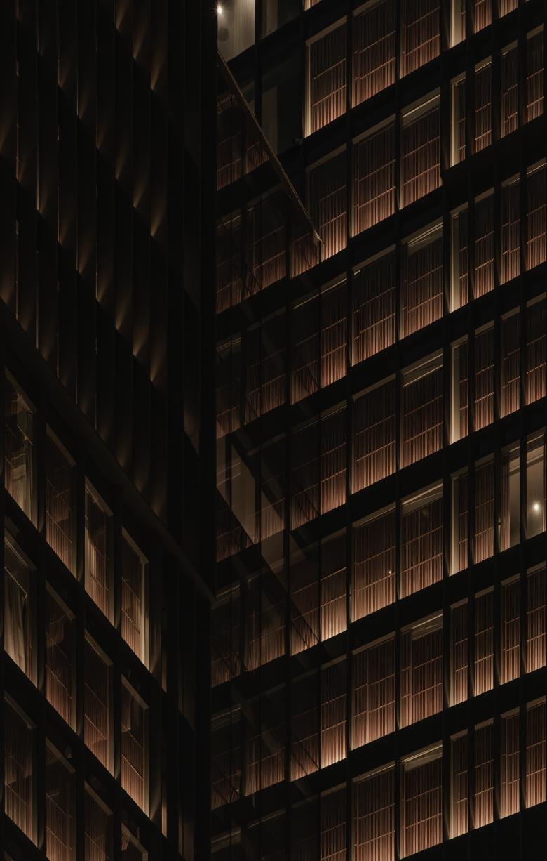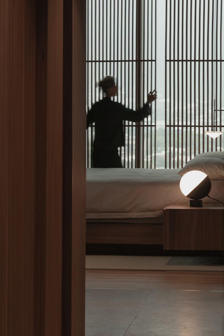 El sistema de celosías actúa como elemento vertebrador del proyecto. En la fachada, las lamas de aluminio generan un movimiento constante de luces y sombras que modula la percepción del edificio a lo largo del día. En el interior, esta idea se reinterpreta en madera de encino, aportando calidez, continuidad y un ritmo visual que unifica el conjunto. La luz —filtrada o directa— se convierte en materia arquitectónica: define los volúmenes, suaviza las texturas y acompaña la experiencia del huésped.