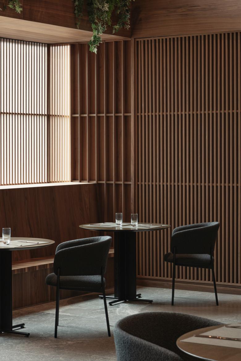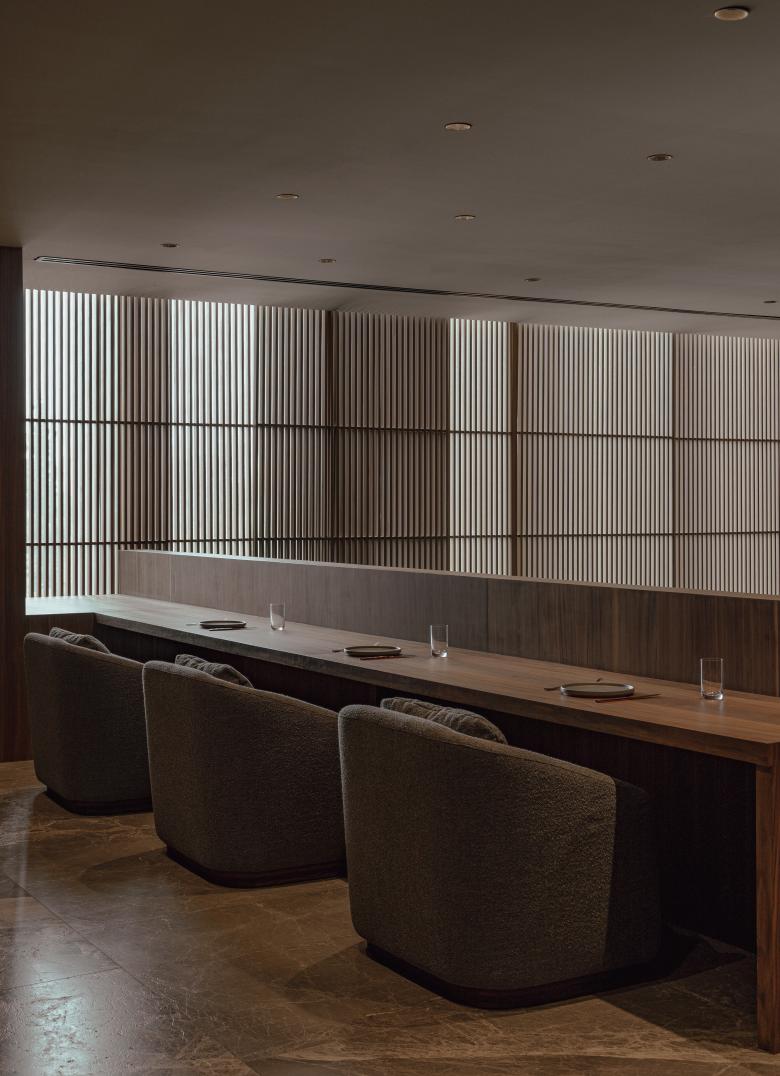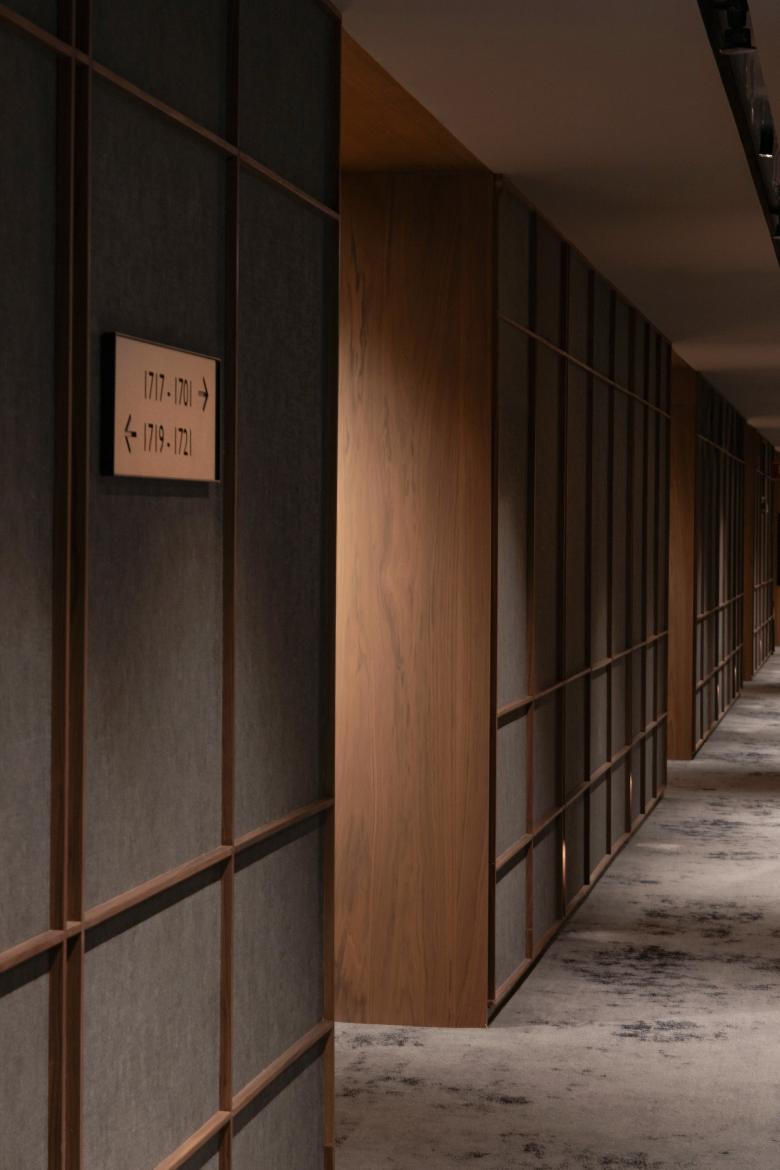 En los niveles superiores, el Club Lounge ofrece un espacio reservado para desayunos o encuentros informales. Se distingue por las grandes celosías de madera que filtran la luz de la fachada y suavizan el diálogo con la ciudad. Este gesto, coherente con el lenguaje general del proyecto, genera una atmósfera templada donde la claridad adquiere una presencia casi material.