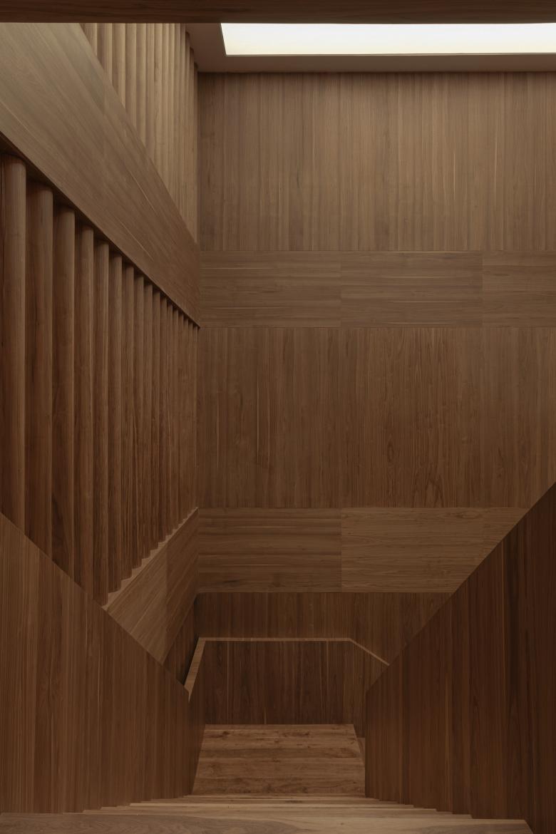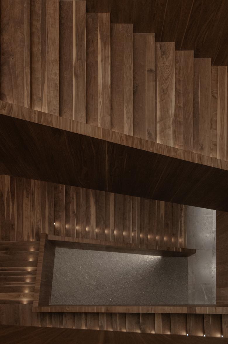 Uno de los elementos más representativos es la gran escalera que conecta las primeras plantas. Concebida como una escultura habitable, está completamente revestida en madera de encino, generando una atmósfera envolvente. Las superficies onduladas que acompañan su trazado refuerzan la sensación de continuidad y movimiento, un gesto que se repite en otros escenarios, como la antesala de las salas de convenciones o el frente del mostrador de recepción.